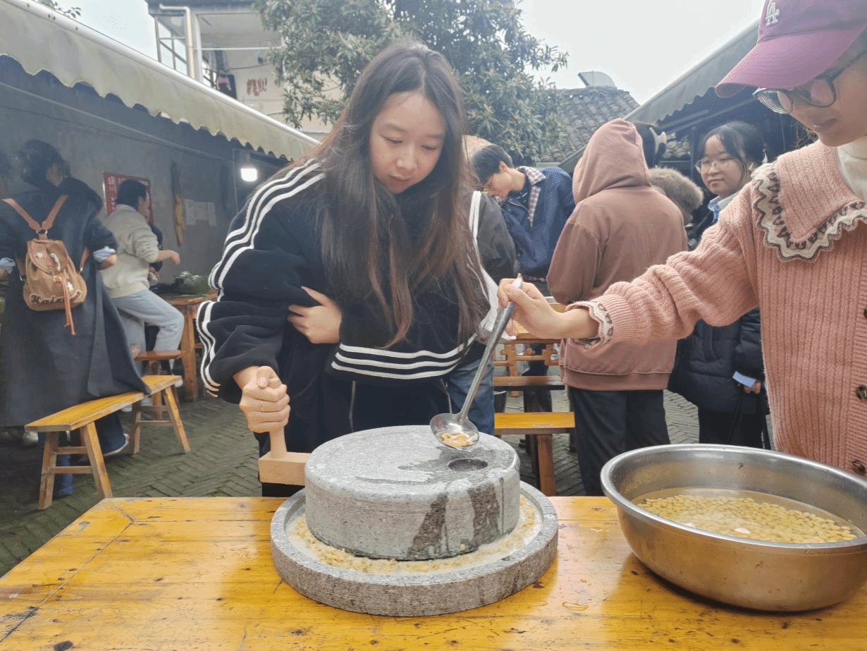 在体验环节,同学们还亲身体验做石磨豆花、枕头粑等传统美食和竹编、火绘等非遗艺术品,体悟到太平古街的历史不仅是石磨转动的咔吱声、火笔烙下的焦香,更是一群手艺人用文化振兴故乡的实践。