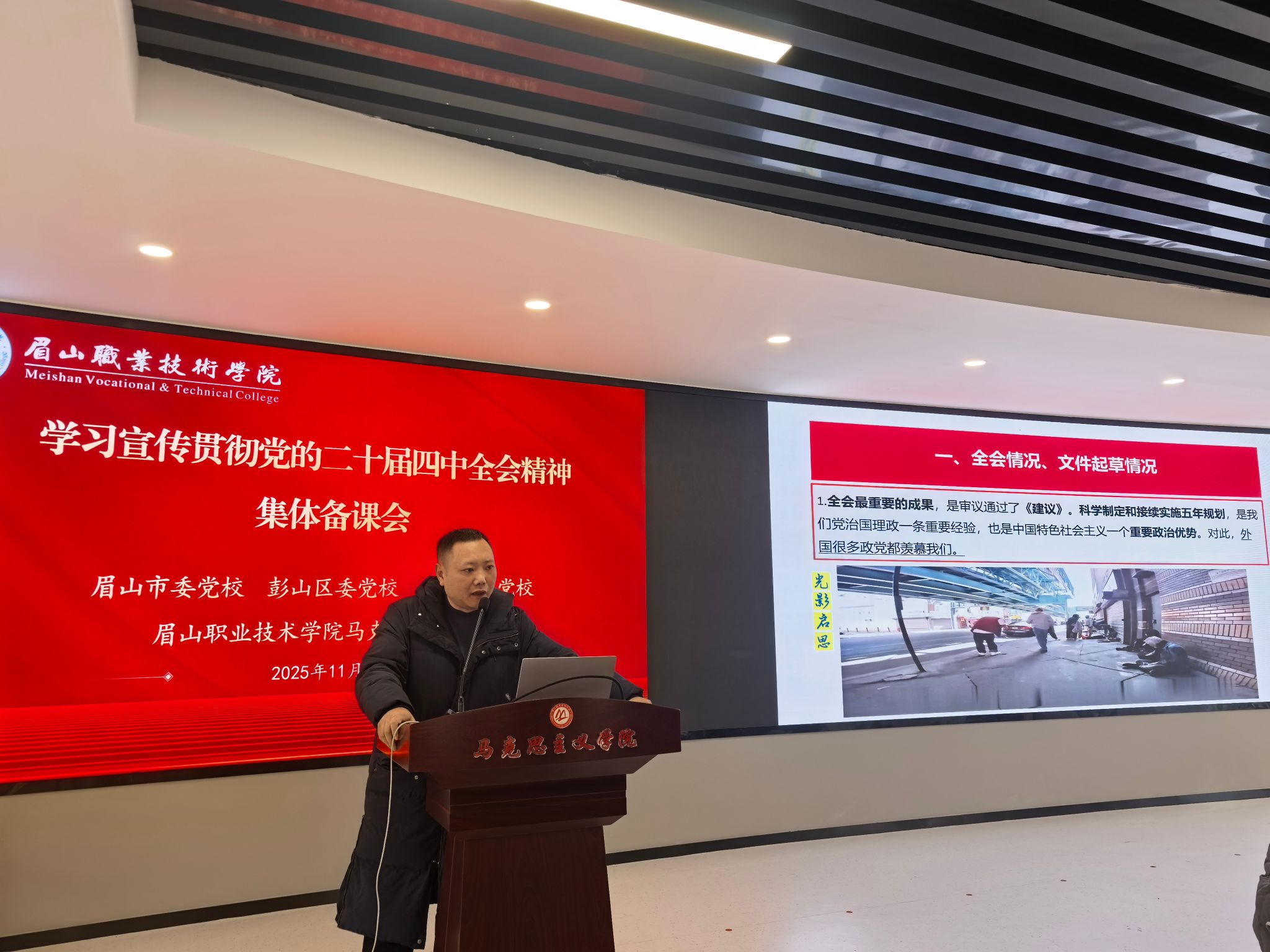 为深入学习宣传贯彻党的二十届四中全会精神,精准把握全会核心要义与实践要求,提升教学的政治性、理论性、针对性和实效性,11月26日,马克思主义学院联合眉山市、区、县党校在思政虚拟仿真教育基地开展学习宣传贯彻党的二十届四中全会精神集体备课会。学校党委书记代贤军、眉山市委党校副校长向健民出席会议并讲话,会议由眉山职业技术学院组织人事部部长、马克思主义学院党总支书记、院长廖敏主持。