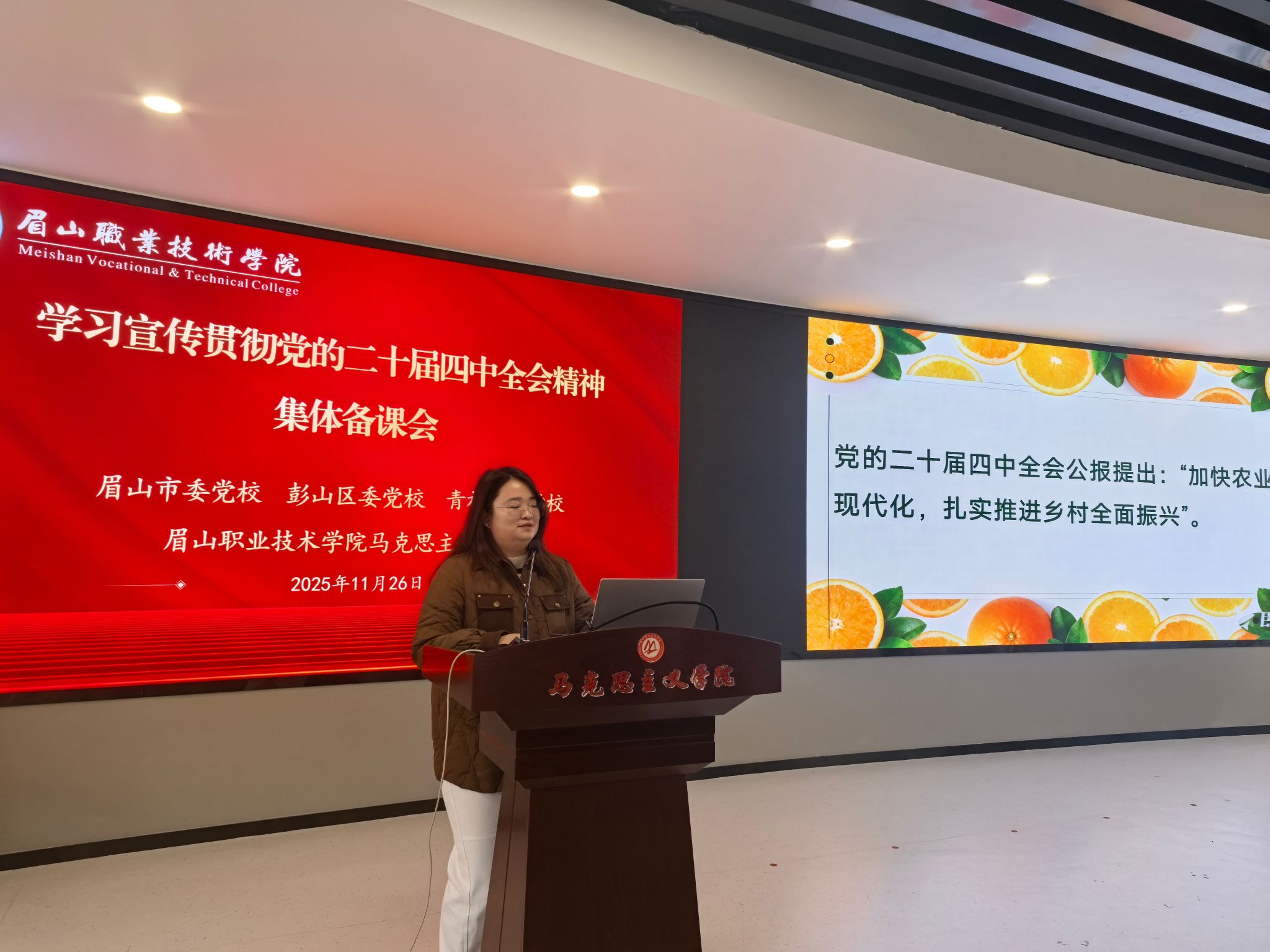 会上,我校杨超、付蕾两位思政课教师分别作了题为“学习党的二十届四中全会精神 争做新时代有为青年”“小柑橘撬动大战略:全面推进乡村振兴的理论与实践”的教学展示,眉山市委党校三级调研员李太权、青神县委党校常务副校长邓德军进行了点评。