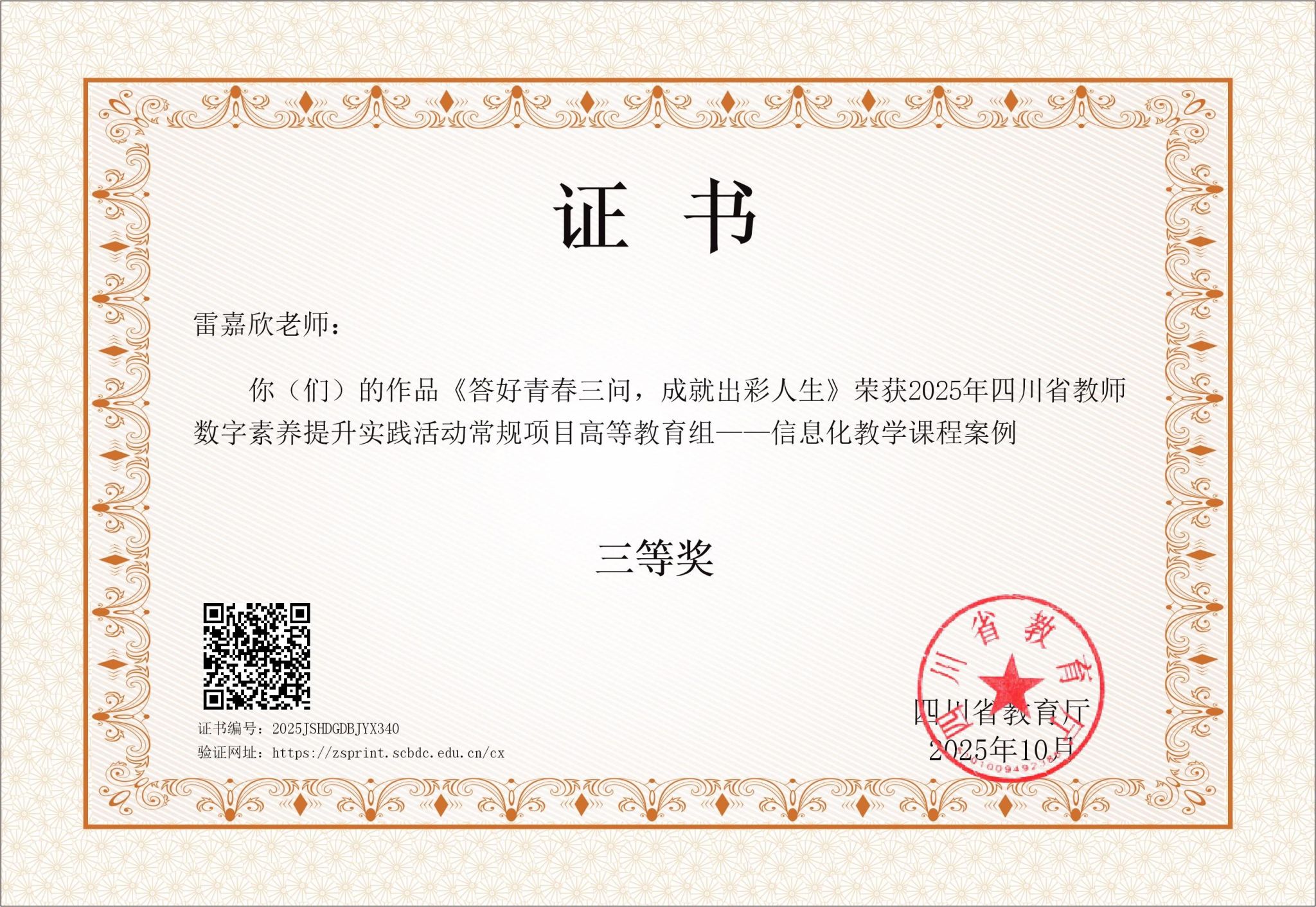 近日,由四川省教育厅主办的2025年四川省教师数字素养提升实践活动评选结果正式公布,我院教师雷嘉欣的作品《答好青春三问,成就出彩人生》荣获常规项目高等教育组——信息化教学课程案例三等奖。该作品集中展示了教师在课堂教学中深度融合信息技术、创新育人模式的实践智慧。