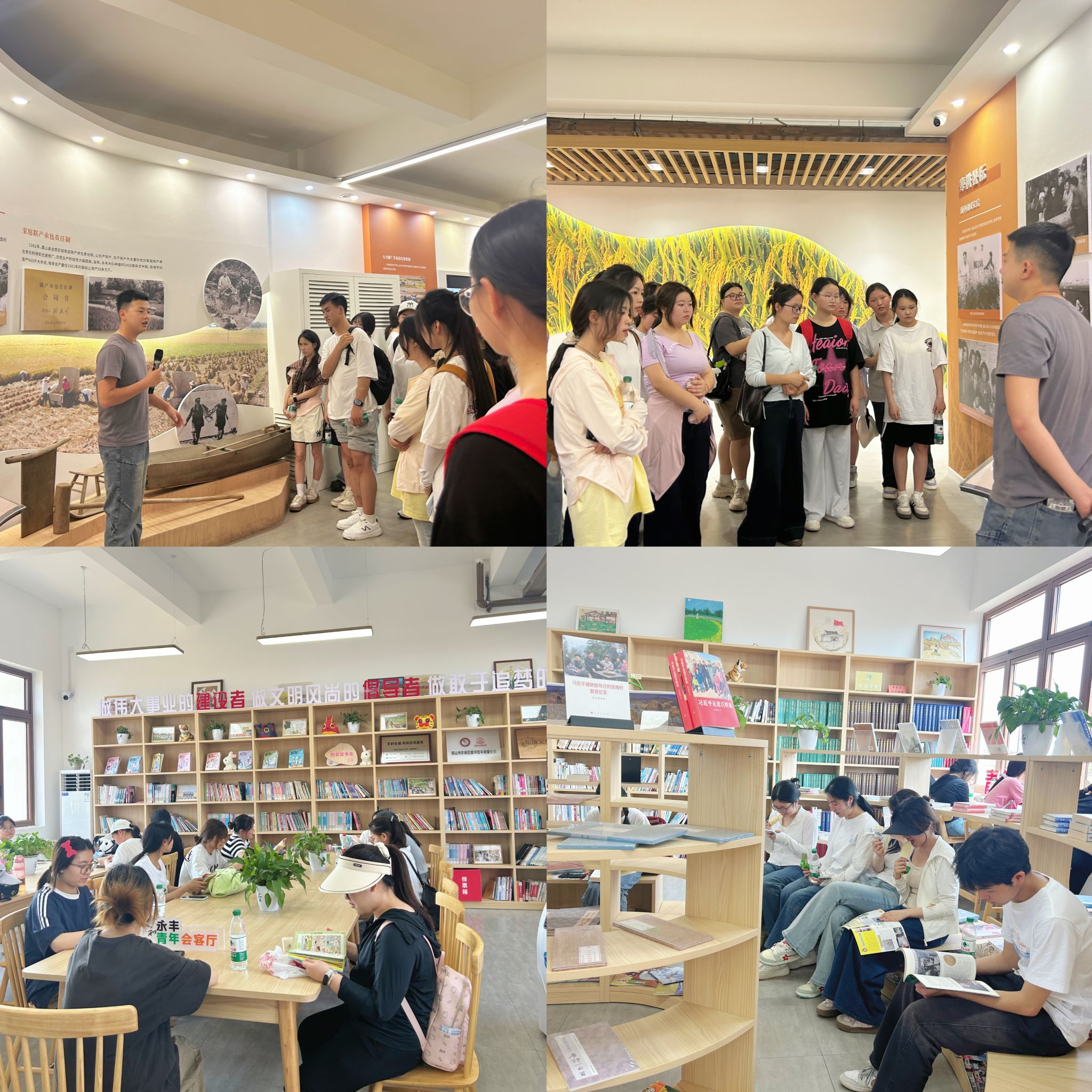 实践参观环节,在基地讲解员的带领下,同学们先沿着习近平总书记在永丰村的足迹,实地探究高标准农田建设的步伐;后参观村史馆、永丰论稻厅,了解永丰村高标准农田的建设历程,直观感受科技赋能与文化传承在乡村振兴中的双重作用。参观结束后,同学们在永丰农家书屋,围绕深刻领会习近平总书记“在新时代打造更高水平的天府粮仓”重要指示精神,联系自身专业实际开展主题研讨,现场学习氛围热烈。