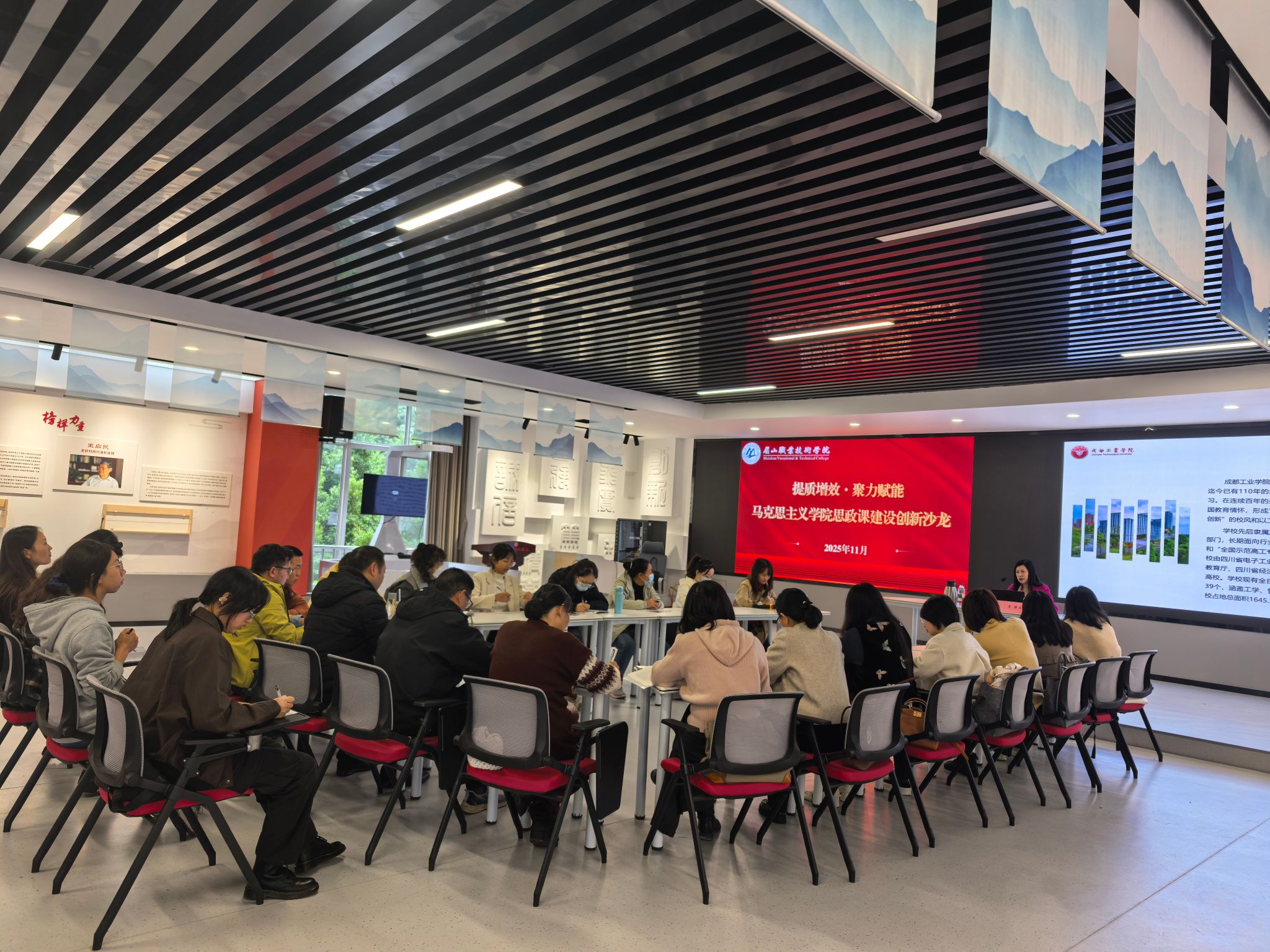 为深入学习领会习近平总书记对学校思政课建设作出的重要指示精神,推动思政课改革创新,11月14日,马克思主义学院在虚拟仿真基地举办赋能提质沙龙第二期。本次沙龙聚焦“数字化转型下思政课教学及思政课程建设”,特邀成都工业学院马克思主义学院院长、全国优秀教师、四川省“天府青城计划”教育领军人才罗英教授主讲。
