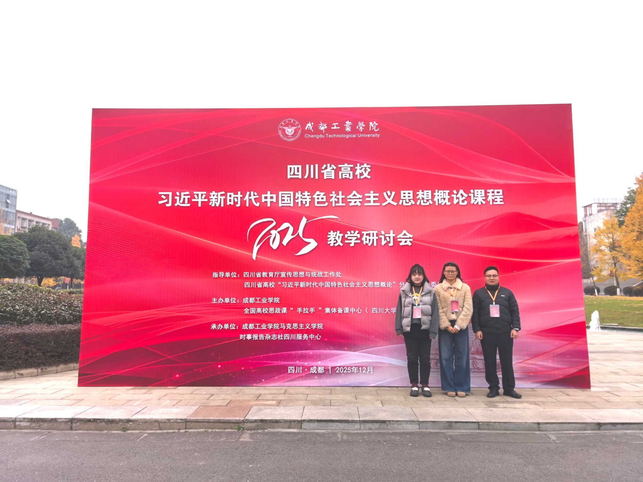 12月6日,四川省高校“习近平新时代中国特色社会主义思想概论”课程2025年教学研讨会在成都工业学院郫都校区举行。本次研讨会以“深入学习贯彻党的二十届四中全会精神,守正创新推动思政课建设内涵式发展”为主题,旨在推动思政课守正创新、内涵式发展,提升“习近平新时代中国特色社会主义思想概论”课程教学质量与育人实效。来自省内外90余所高校的马克思主义学院负责人、思政课骨干教师及专家学者共聚一堂,开展深度研讨与教学交流。我院教师贺描、陈亿、李莎参加本次会议。