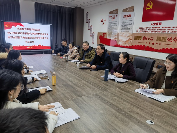 1月10日,农业技术系教师党支部组织全体党员在6301开展学习贯彻习近平新时代中国特色社会主义思想主题教育专题组织生活会暨民主评议党员大会。学校党委委员、副院长张望出席会议。