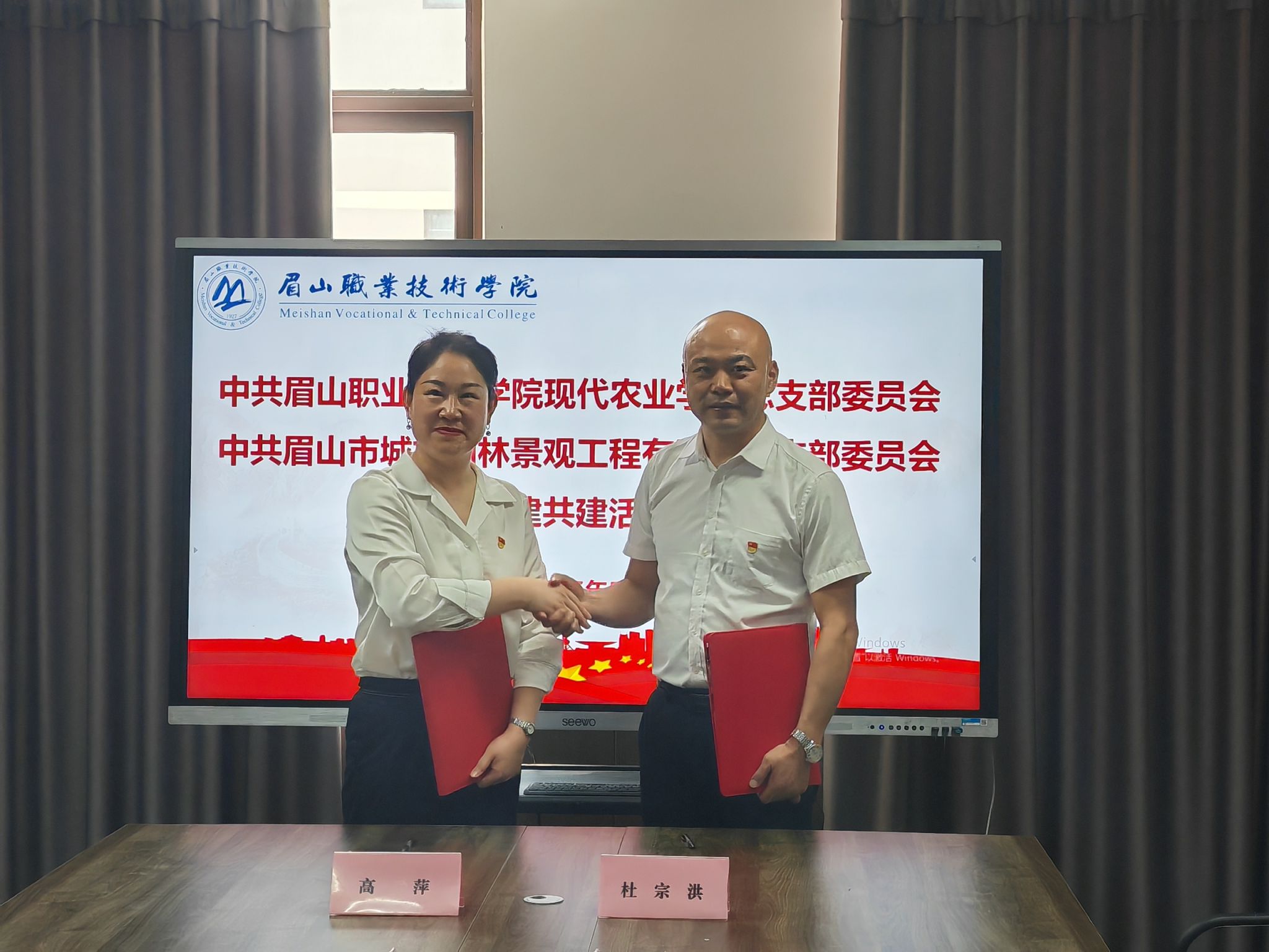 在座谈交流会上,现代农业学院党总支书记杜宗洪介绍了近年党建工作成果,他表示,此次合作是涉农专业服务地方经济的重要实践,希望以此次党建结对共建为契机,在资源共享、项目共研、人才共育等方面深入合作,推动涉农专业教育与农业产业链需求精准对接,共同为产业发展提供智慧与力量。眉山市城投园林景观工程有限公司党支部书记、董事长高萍介绍了眉山市城投园林景观工程有限公的基本情况,他表示,公司与现代农业学院建立长期合作关系以来,双方充分发挥各自优势,在产学研用上取得了显著成效,此次党建联建是学院深化产教融合、创新人才培养模式的重要成果。随后,校企双方共同签署了《结对共建合作协议》。