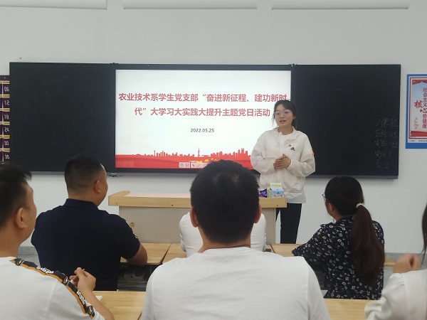 5月25日,农业技术系学生党支部在6208开展“‘奋进新征程、建功新时代’大学习大实践大提升”主题党日活动,活动由学生党支部书记王岚主持。