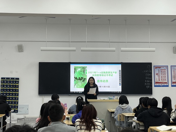 11月10日,农业教研室彭婷老师在6206开展了设施蔬菜职业技能等级证书宣讲会,现代农业技术专业100余名学生参加。