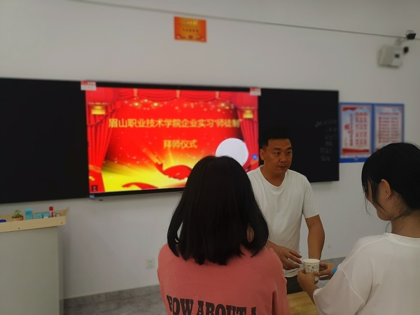 6月8日,眉山职业技术学院内进行了一场特殊的拜师仪式,周紫若、阿西公仁、徐功盛、张宝林、李向雨、潘秋阳、杨蕊、胡宇、鲜阳、杨茹萍、张丽等优秀学生代表以“敬茶拜师”的传统方式,向师傅孙林等行拜师礼,孙林根据徒弟的工作岗位赠送了自制的工具和几本精心挑选的书籍,师徒从此结对。