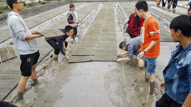 3月21日、27日下午,我们16级现代农业技术1、2班全体同学在刘长江老师的带领下,先后来到种植大户巫志祥的水稻育秧播种场地。首先,由巫志祥介绍了水稻机播硬盘育秧优缺点及工作原理,讲解了操作步骤及注意事项,然后刘老师讲解了操作要求及实训过程要思考的问题,并进行了分组分工轮换操作实训,分别进行了播种机播种、布塑料纱网、秧盘的摆盘、搭拱、盖膜操作。通过亲身体验现代农业背景下的水稻新型育秧技术,认识到育秧技术的优点及其应用的必要性,能够初步掌握育秧技术的基本流程与要领,对这一先进技术达到一个系统性与综合性的认识。通过老师和种植户的讲解以及亲自操作,对于水稻播种技术、播种机的使用、育秧盘的摆放等相关知识得到了理解和掌握,提高了实践操作能力。所以非常感谢老师和种植户为我们提供的宝贵机会。