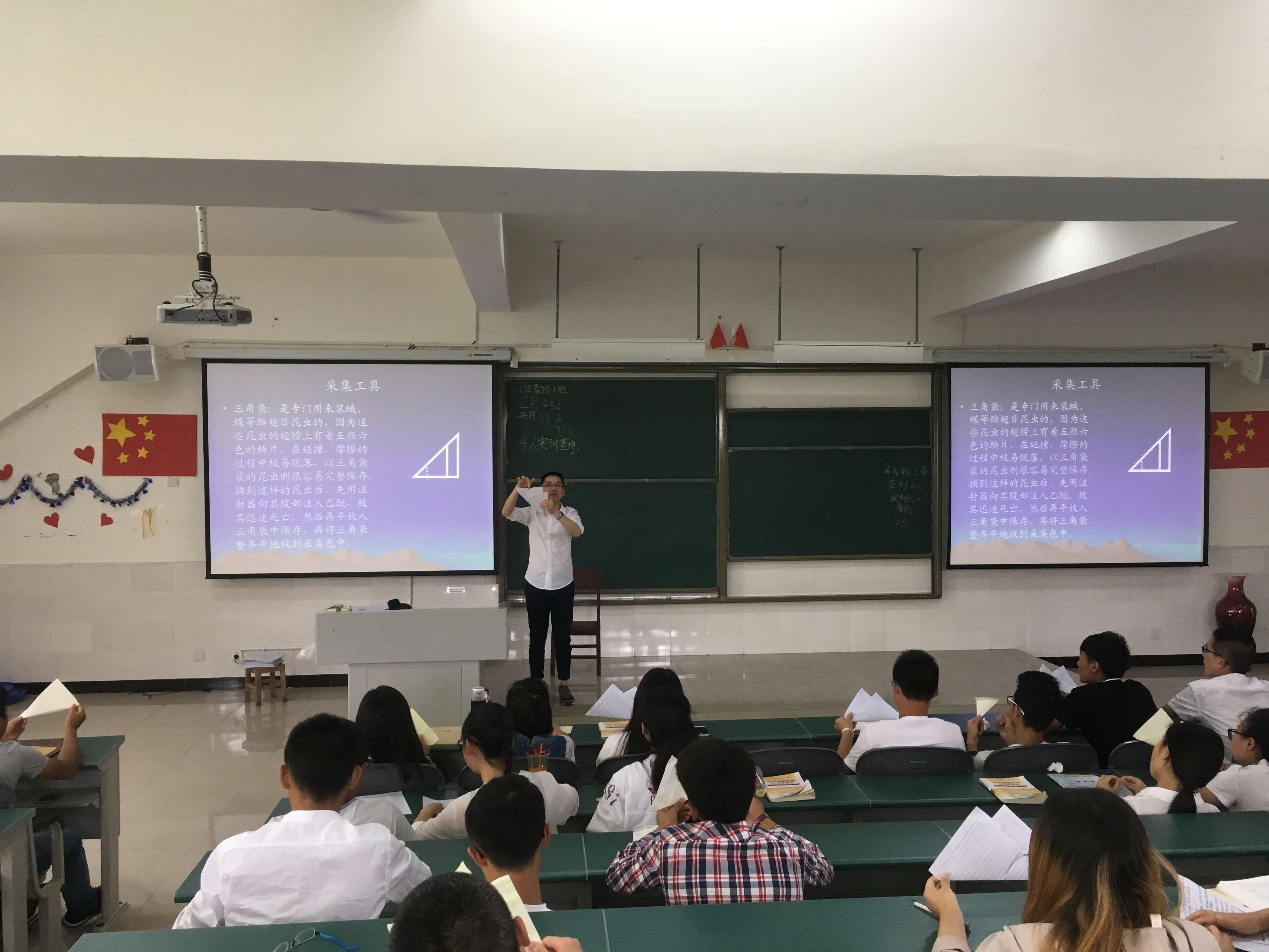 为了更好地提高学生对植物保护专业知识技能的运用,5月15至16日,农业技术系现代农业技术专业开展了为期两天的植物保护技术课程的校外集中实训。实训前,承担该课程的周建华老师与刘明洁老师分别对参与该次实训的16级现代农业技术专业的同学进行了系统的野外实训技能培训。首先刘老师结合PPT为同学们详细介绍了需要使用工具的制作方式和注意事项,随后,又结合具体的昆虫翅目讲解了昆虫采集的方式以及标本制作、保存的方法步骤,同时,还将已授专业知识与此次实训中可能遇到的实际问题有效地联系起来,为同学们梳理了课本知识的同时还帮助其明确了此次实训的目的意义。最后,周建华老师为同学们明确了具体任务,并强调了野外实训的安全注意事项和安全第一的根本准则。