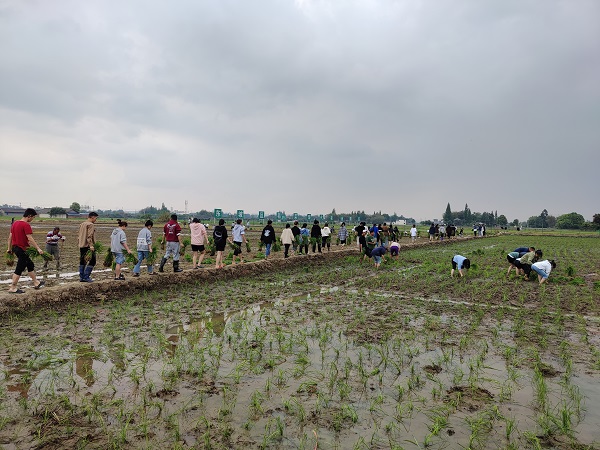 随后,在专任教师的指导下,以小组为单位,同学们挽着裤脚,有序进行了水稻移栽。经过一天的劳作,同学们完成了二十余亩水稻的移栽,秧苗整整齐齐地插在水田里,呈现出一片生机盎然。