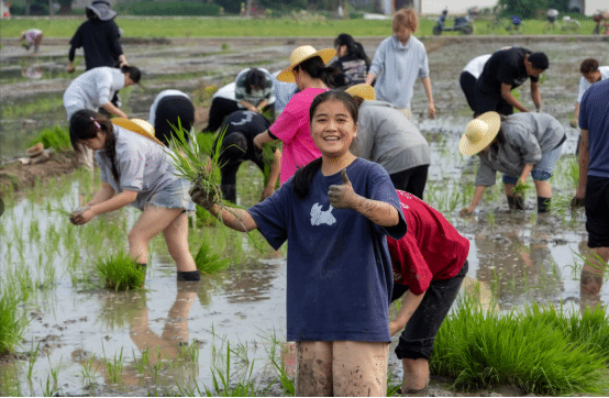 活动中,专业农技人员和专任教师分别现场演示插秧手法,讲解株距、行距等种植要点。学生们挽起裤脚、弯腰躬身,在水田中协作完成插秧作业,亲身体验农耕辛劳。
