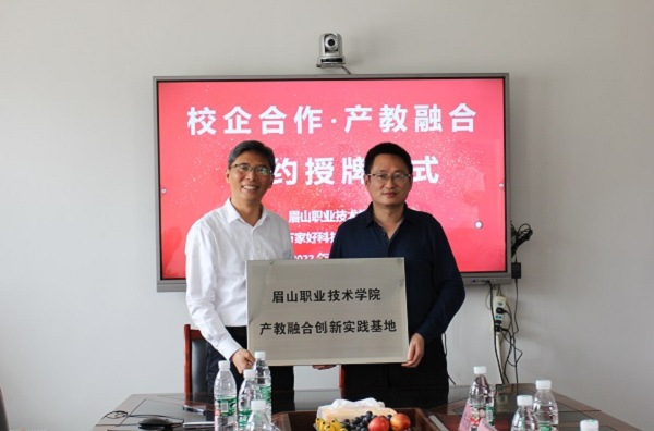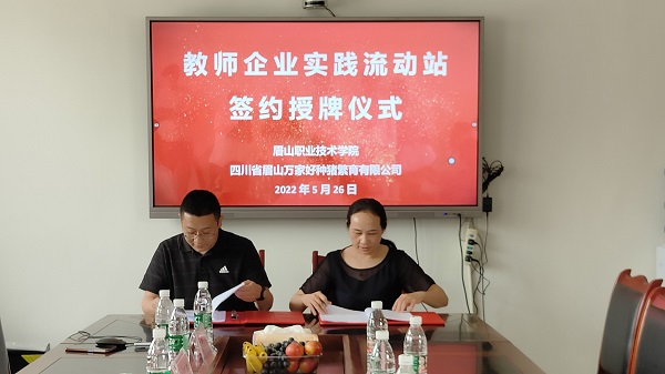 杨加琼代表农业技术系与眉山万家好种猪繁育有限公司签订教师企业实践流动站协议;徐井万代表学院与眉山万家好种猪繁育有限公司签订校企合作协议,并授牌“眉山职业技术学院教师企业实践流动站”“眉山职业技术学院产教融合创新实践基地”。