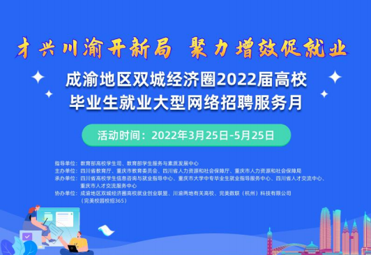 为深入贯彻党中央、国务院“稳就业”“保就业”决策部署,落实《成渝地区双城经济圈高校就业创业协同发展行动方案》重点任务,推动川渝高校就业创业工作“一体化”协同发展,搭建川渝两地高校与企业之间的良好供需平台,助推川渝两地2022届高校毕业生更加充分、更高质量就业,经研究,定于今年3月-5月举办‘成渝地区双城经济圈2022届高校毕业生就业双选活动暨2022年校企人才供需洽谈会”,活动时间:2022年3月25日-5月25日。二、活动主题:オ兴川渝开新局,聚力増效促就业,请广大毕业生积极参与,具体事宜点击下载下方附件查看。