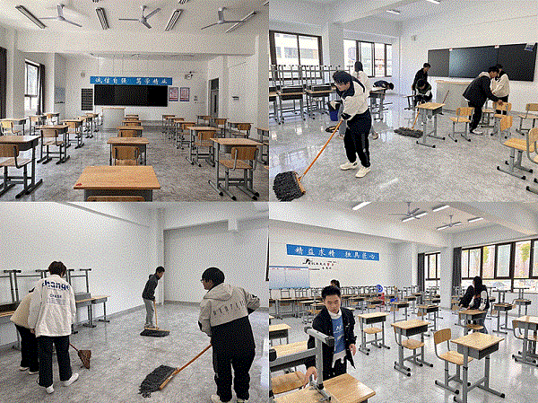 劳动实践教育可以促进学生形成勤俭节约、踏实肯干、团结协作的优良品质。活动中,各班级在辅导员老师的带领下,对学校第六教学楼的所有教室进行了打扫、清理,摆放课桌、扫地、拖地、抹灰……劳动的身影在春日的教学楼里穿梭。
