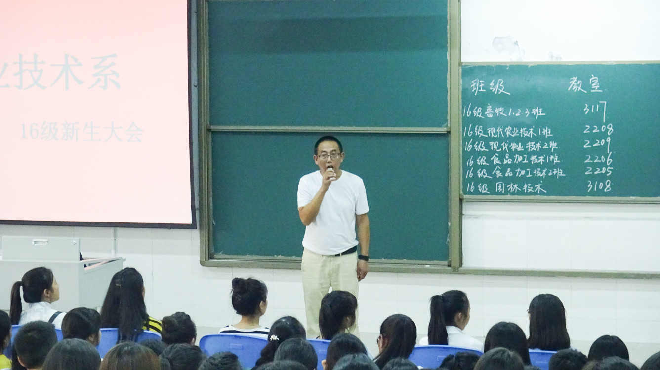 清凉的风吹过,带走丝丝难耐的暑气。清新的面孔注入校园,带来一股新鲜的气息。为提高新生对大学的认识,我系于2016年9月11日晚上在3117教室开展新生入学大会。 参与本次大会的有农业技术系党总支书记赵建聪,农业技术系主任杨加琼,农业技术系团支部书记方和俊,农业技术系各辅导员老师,农业技术系学生会干部以及农业技术系2016级349名大一新生。