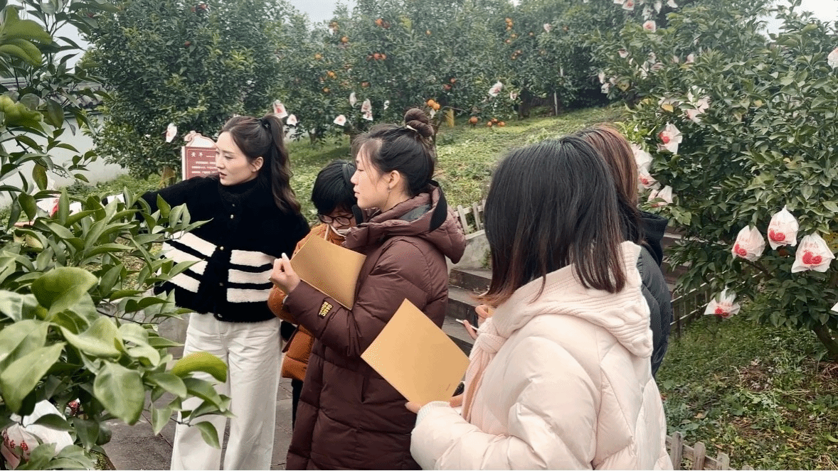 在中国晚熟柑橘博览园,成员们系统学习了晚熟柑橘在种质资源保护、标准化种植等前端环节的发展现状,对数字农业、智慧种植的实际应用有了更直观的理解。随后,实践团走进生态源出口水果基地。作为丹棱柑橘产业标准化种植的样板,基地内整齐的果园和完善的水肥一体化设施让成员们眼前一亮。基地负责人详细介绍了出口水果的种植标准与质量管控体系,成员们结合专业知识,就出口果品的品质要求、国际市场趋势等问题与技术人员进行了深入交流。