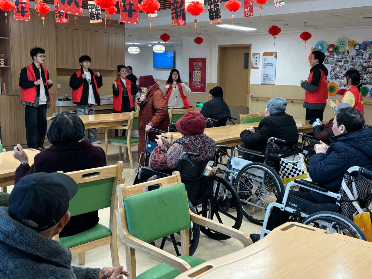 活动中,志愿者们贴心细致地帮助行动不便的老人整理衣物、舒展身心,耐心引导老人们参与轻松愉快的拍拍操互动环节,在欢声笑语中拉近与老人的距离。现场气氛温馨融洽,老人们在志愿者的陪伴下绽放笑容,身心得到舒缓。志愿者们还为老人们送上新鲜水果等慰问品,陪老人唠家常、倾听心声,用真诚的陪伴驱散孤单,让敬老院内洋溢着浓浓的温情。