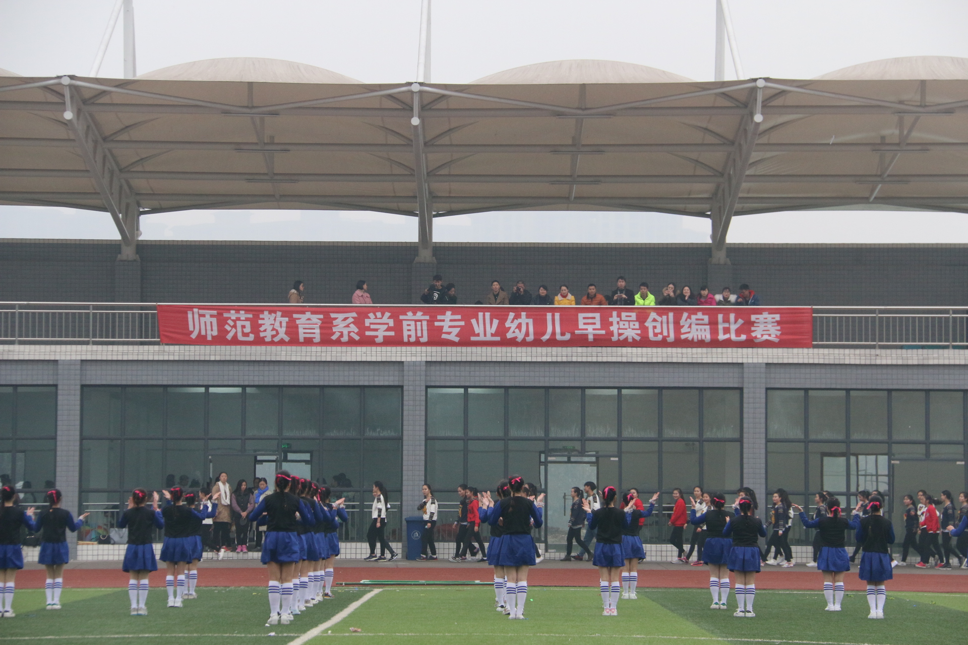为提高学前教育专业学生幼儿体育职业技能,锻炼学生创编幼儿早操的能力,2016年12月14日下午,师范教育系学前教育专业在运动场举办了第三届幼儿早操创编比赛,师范教育系教学副主任张雪艳(主持工作)、党总支书记丁盛、学前教研室主任郭静到场观摩了比赛,黄艳、李兴龙、孟建、李尚伟、白静等老师担任了本次比赛的评委。