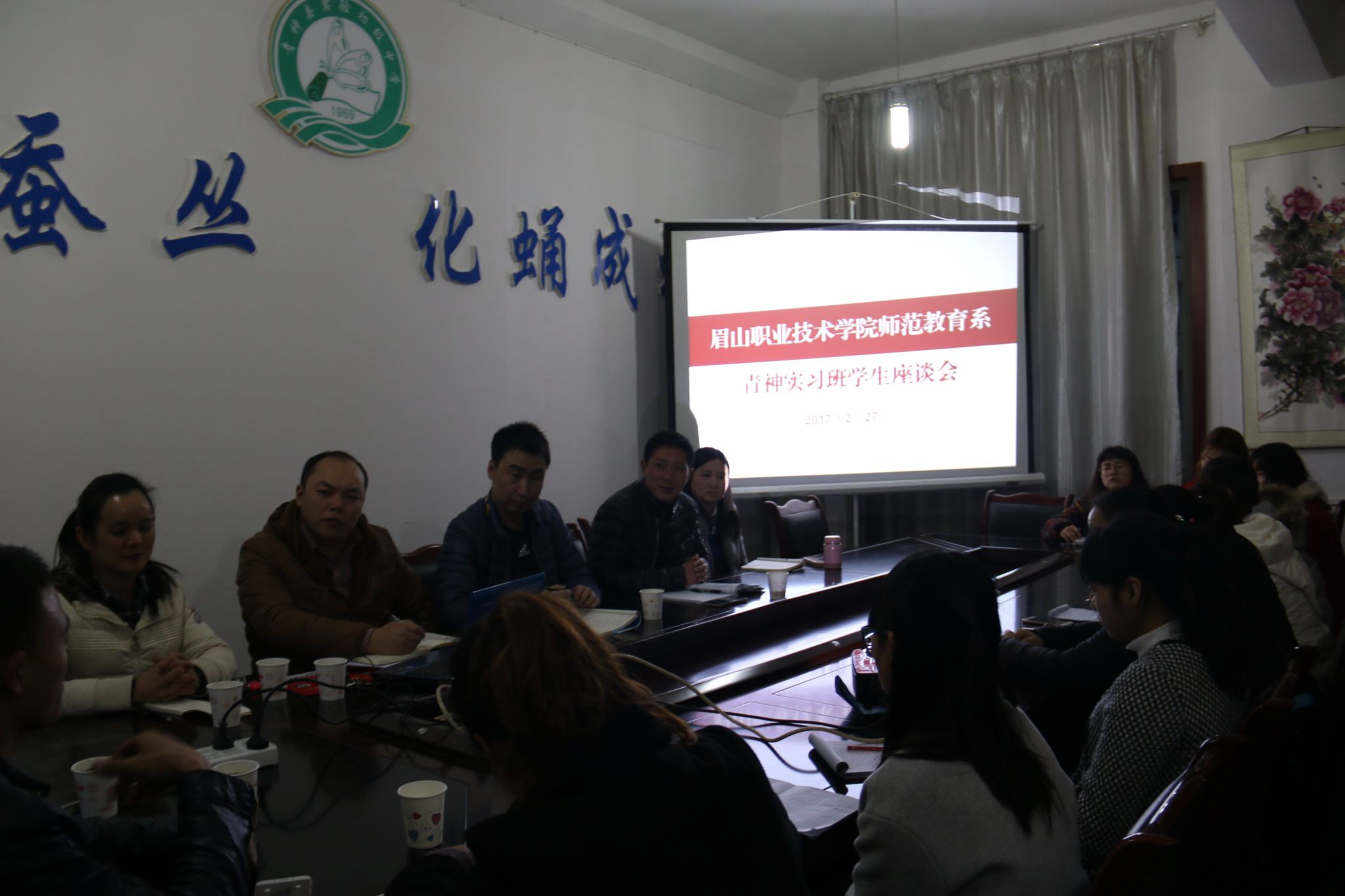 2017年2月28日,师范教育系赴青神县实验中学召开青神实习班实习交流会。系党总支书记丁盛,青神县教育体育局王静,系学生科长李兴龙,小学教育教研室主任胡小波,学前教育教研室主任郭静,全体青神班实习生参加了会议。会议由李兴龙主持。