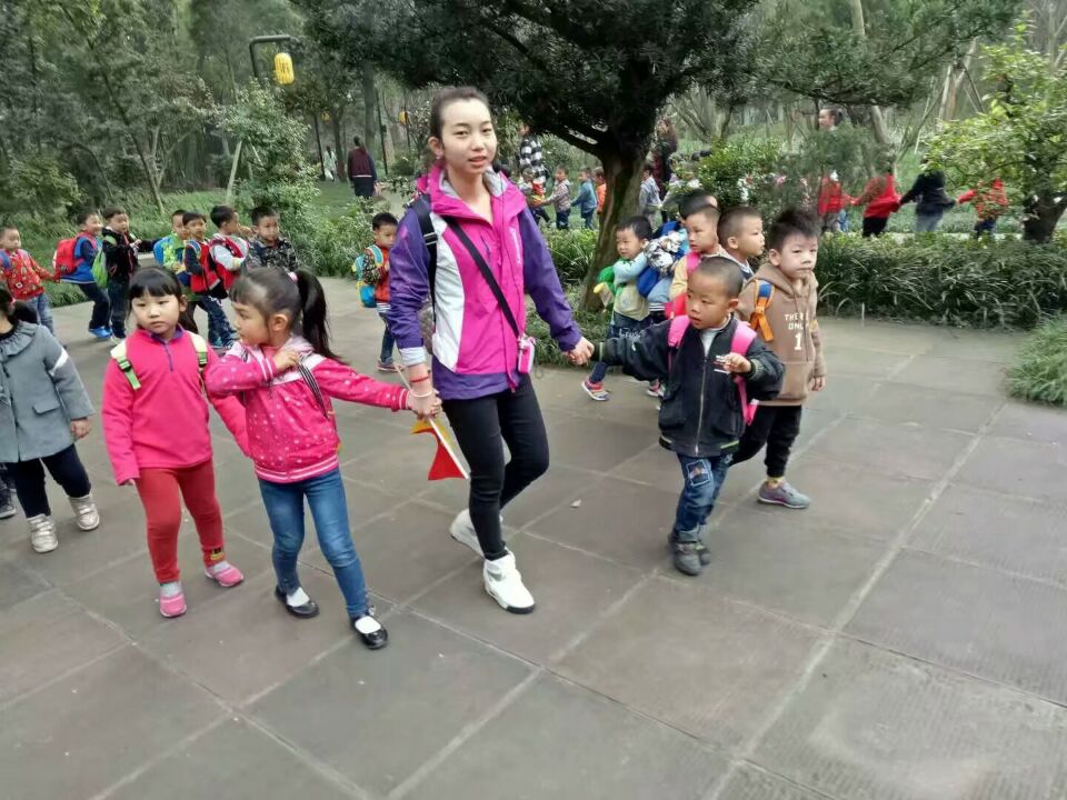 (杨济银带领幼儿园小朋友参加户外活动)