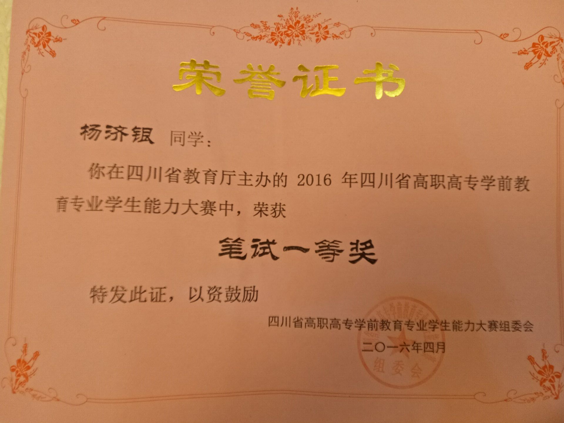 (杨济银同学获得“2016年四川省高职高专学前教育专业学生能力大赛”笔试一等奖)