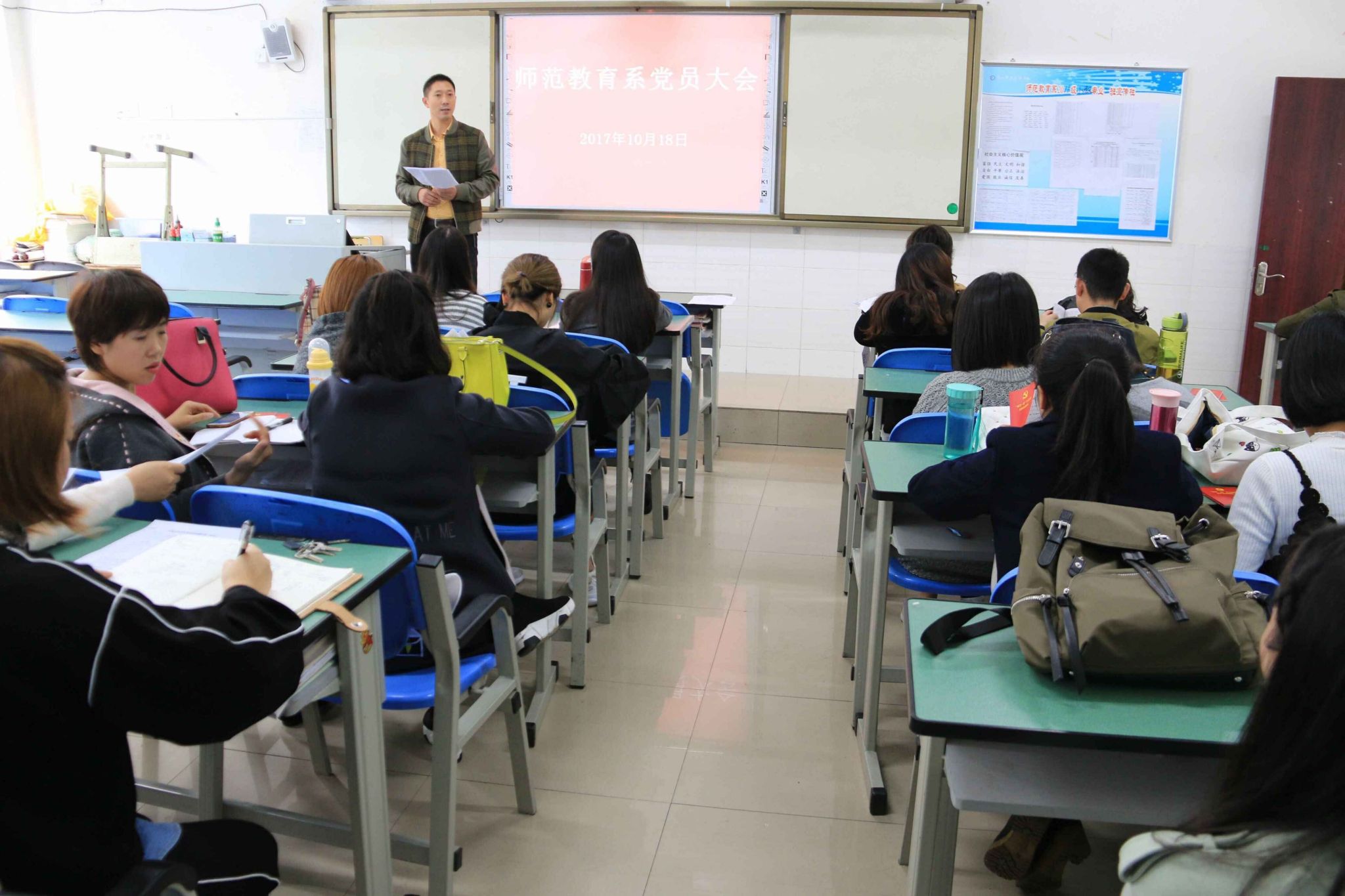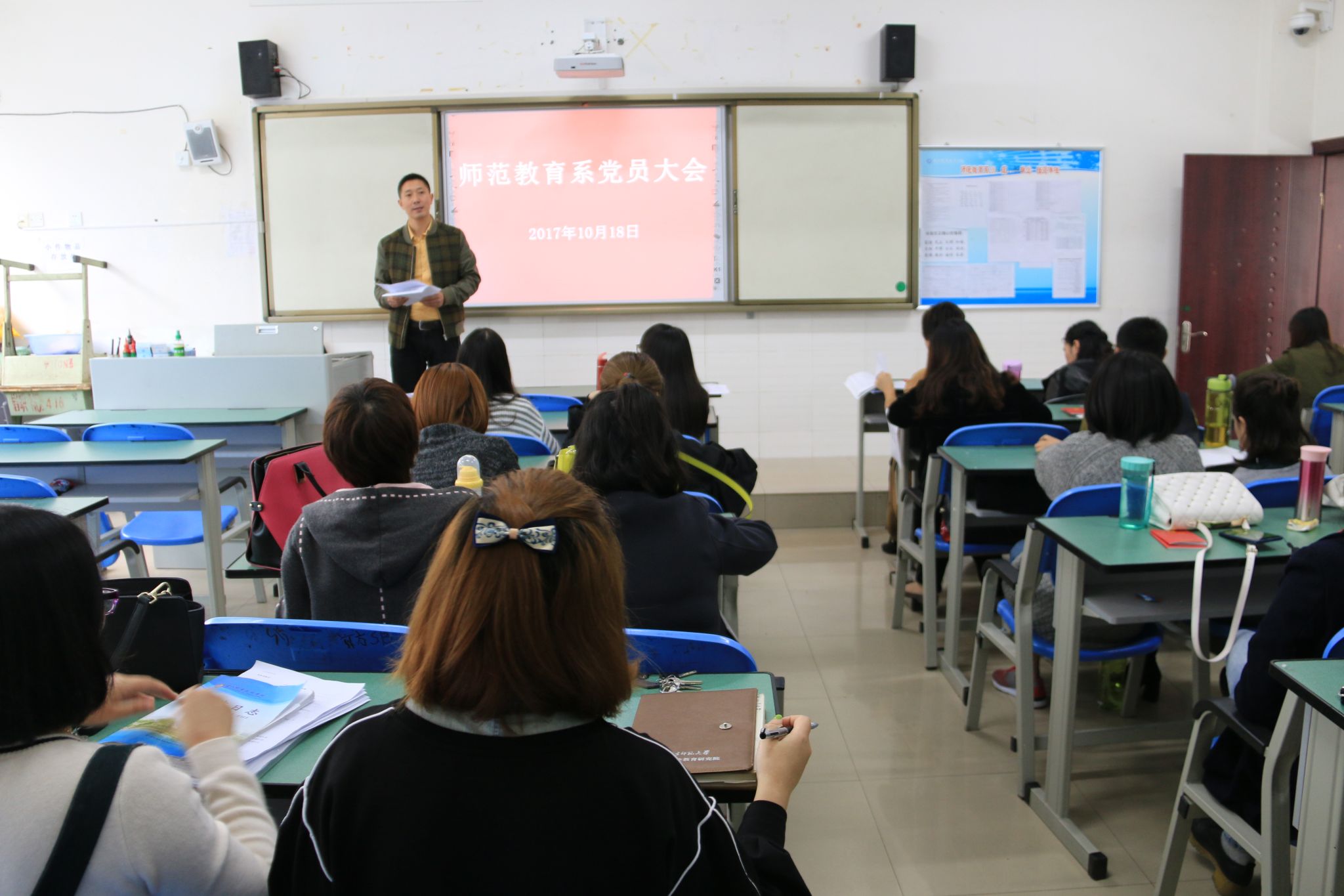 2017年10月18日下午,师范教育系党总支在1208教室召开了党员大会。会议由党总支书记丁盛主持,各支部书记和全体党员参加了此次会议。