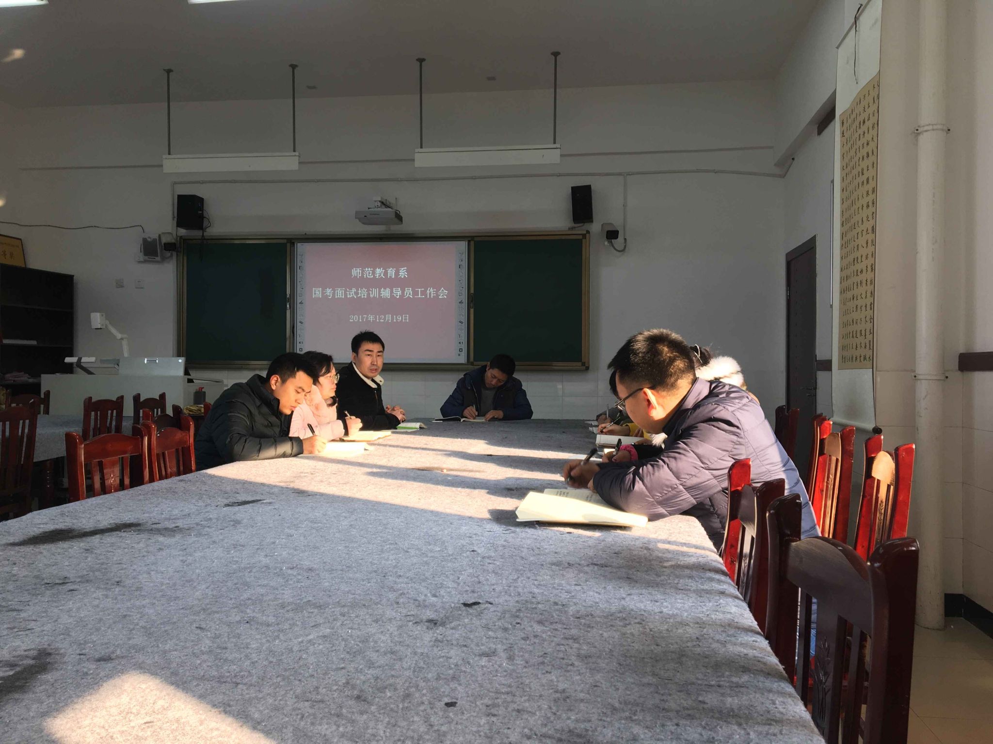 2017年12月19日下午,师范教育系在1207教室召开教师资格证国考面试辅导员培训会议。系党总支书记丁盛、学生科长李兴龙及全体辅导员参加会议。
