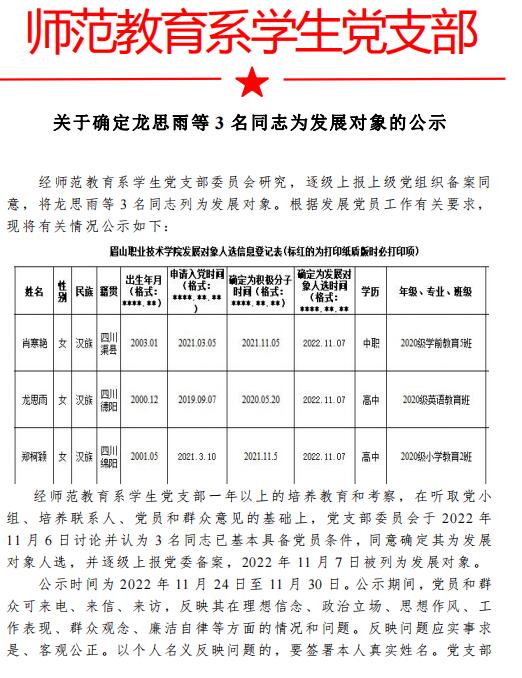 师范教育系学生党支部关于确定龙思雨等3名同志为发展对象的公示