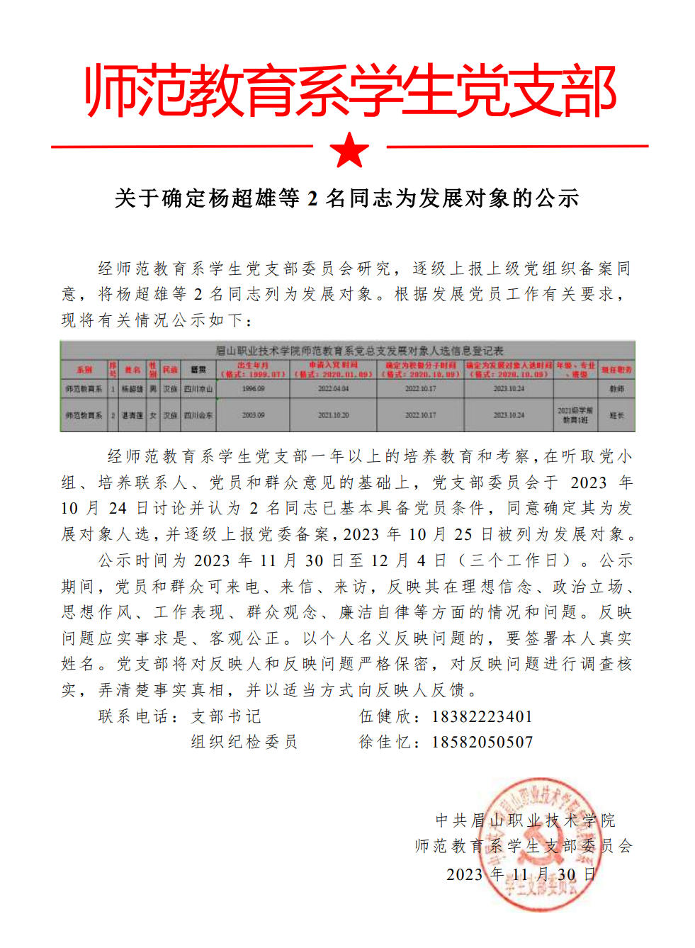 师范教育系学生党支部关于确定杨超雄等2名同志为发展对象的公示