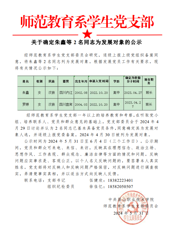 师范教育系学生党支部关于确定朱鑫等2名同志为发展对象的公示