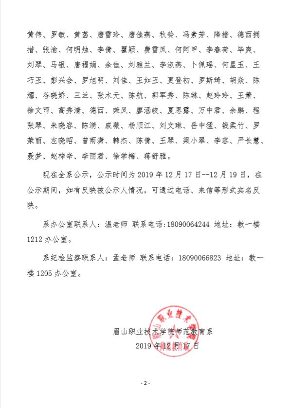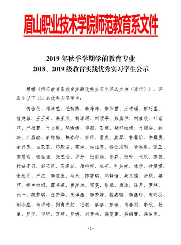 2019年秋季学期学前教育专业2018、2019级教育实践优秀实习学生公示