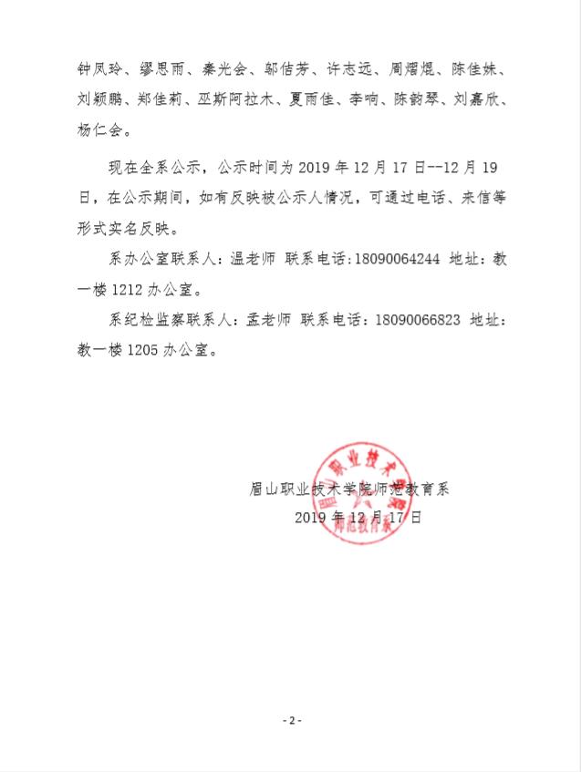 2019年秋季学期学前教育专业2018、2019级教育实践优秀实习学生公示