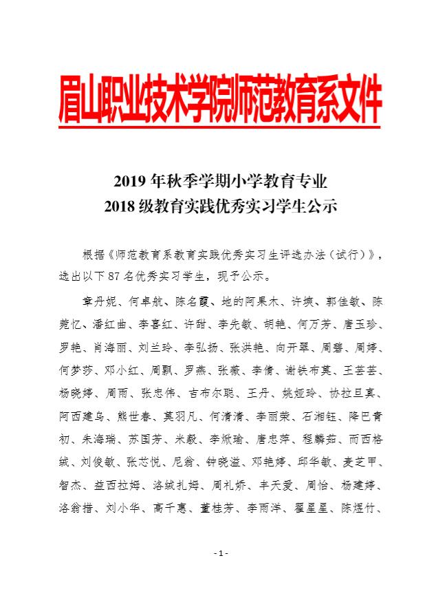 2019年秋季学期小学教育专业2018级教育实践优秀实习学生公示