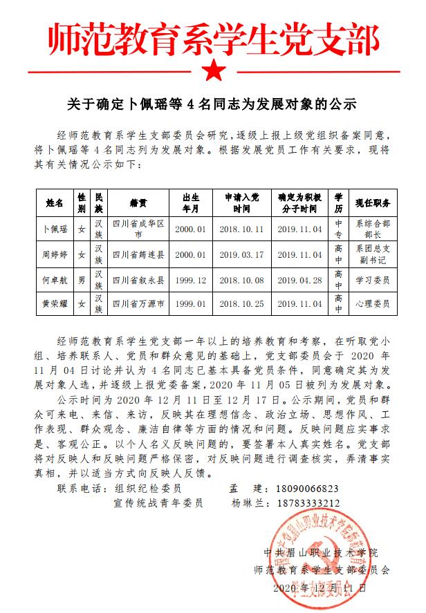 师范教育系学生党支部关于确定卜佩瑶等4名同志为发展对象的公示