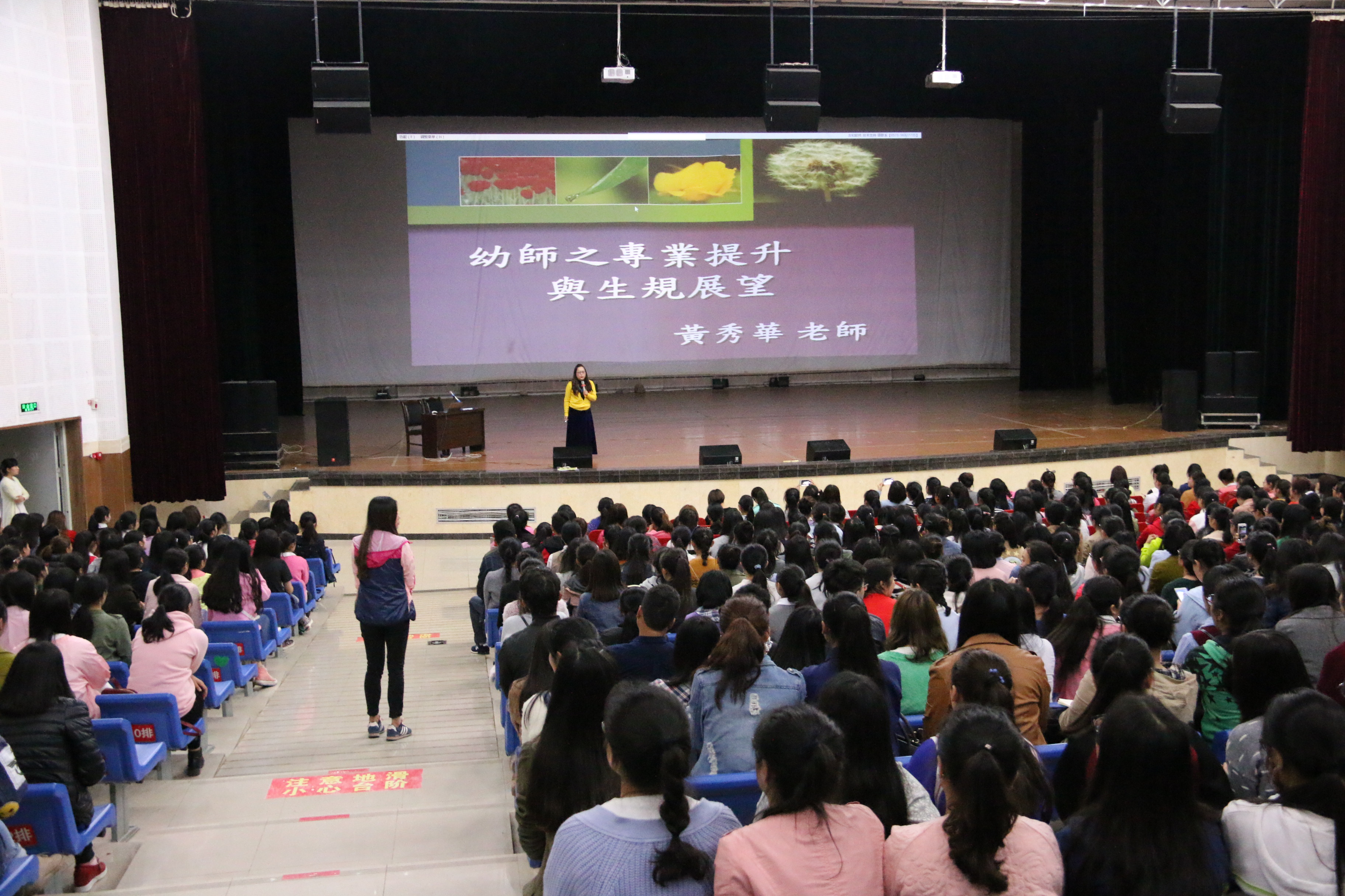 为拓宽我系学前教育专业学生的视野,丰富学前教育专业学生的专业知识,帮助学生正确规划大学生活和职业展望, 2016年4月11日晚自习期间,师范教育系邀请台湾幼教专家黄秀华老师,为我系学前教育专业学生开展了一次名为“幼教之专业提升与职业展望”的专题讲座,师范教育系党总支书记丁盛、系副主任张雪艳、学前教育专业教师及学生聆听了此次讲座。