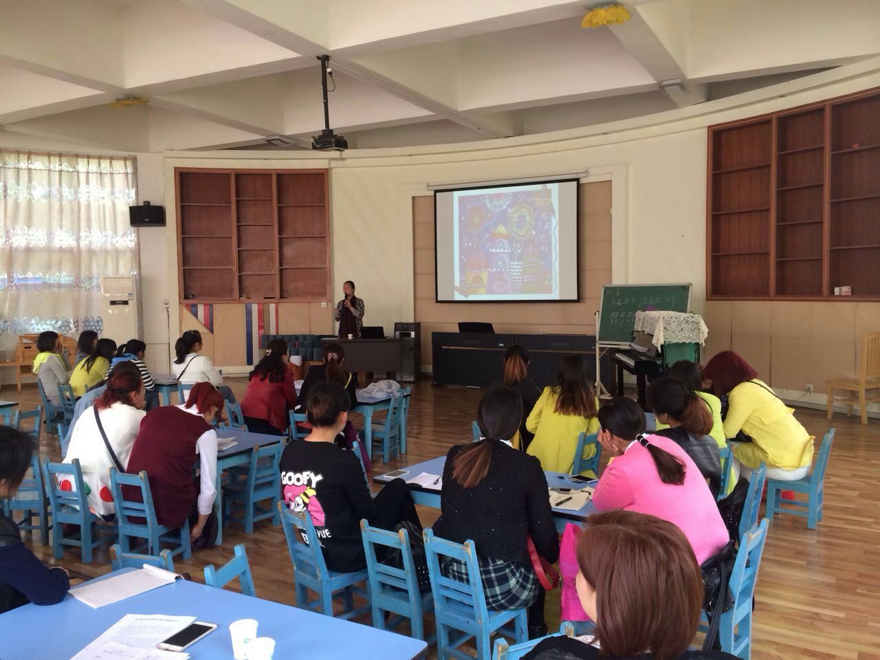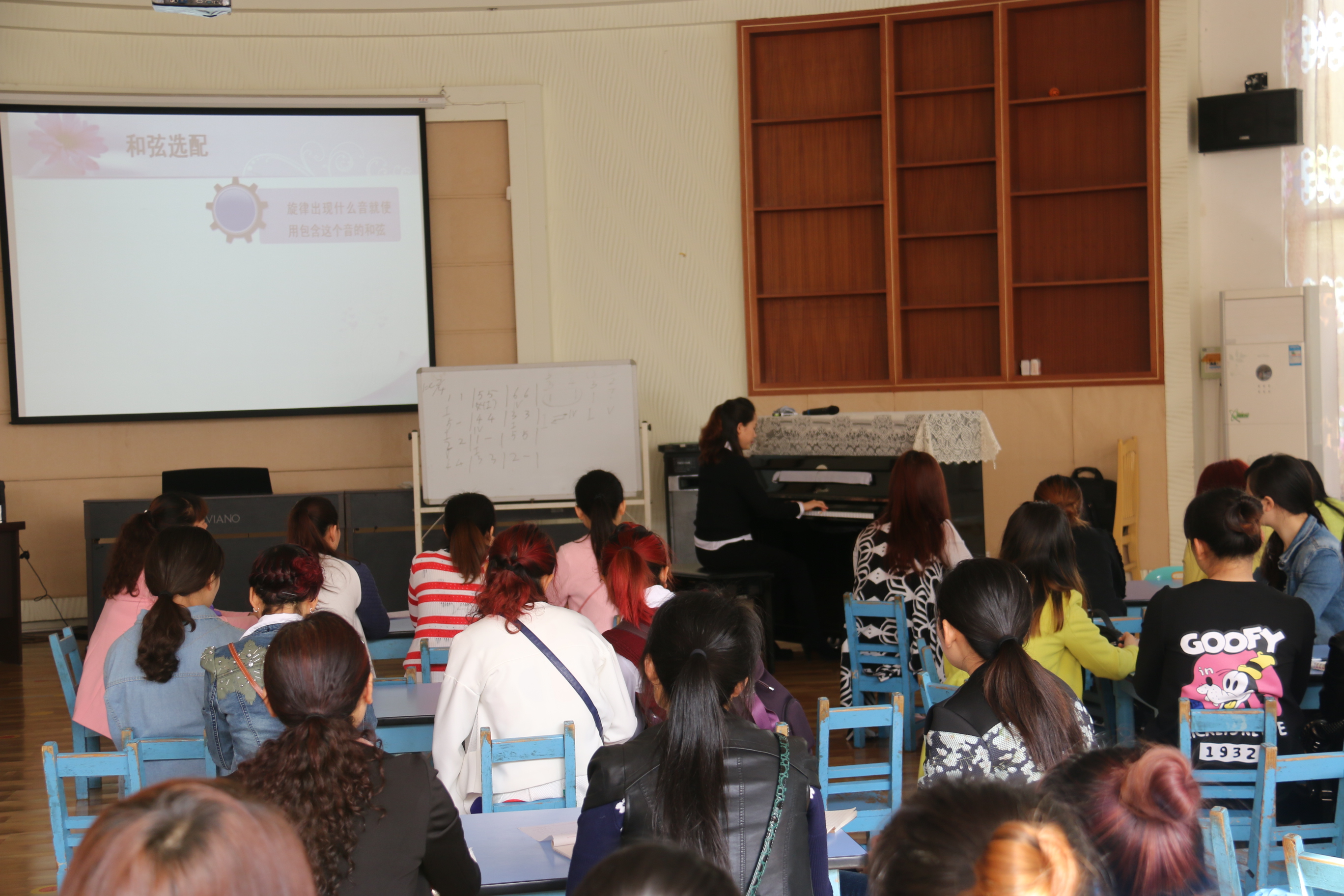 本次培训主要针对该县幼儿教师的需求,围绕绘画、舞蹈以及弹唱三项技能进行培训。学前教育专业带头人、美术组长程雪副教授作了《幼儿绘画技巧与创意》专题讲座,重点从幼儿对绘画的理解与感受入手,归纳分析了幼儿园绘画常用技巧以及在教学中的运用,并以树叶贴画为例引导教师如何利用身边的一切材料进行绘画,培养幼儿的想象力和创造力,提高幼儿的审美能力。学院骨干教师吴沛芹作了《幼儿歌曲弹与唱》的专题讲座,她结合音乐教学的特点,讲解了如何给幼儿歌曲配和弦,以及在教学中如何将弹和唱有机结合并突出唱的表现。舞蹈组组长刘玥作了《幼儿舞蹈的特点和组织幼儿学舞蹈的原则》的专题讲座和示范,学院骨干教师胡艺对参培学员进行了幼儿舞蹈的训练。