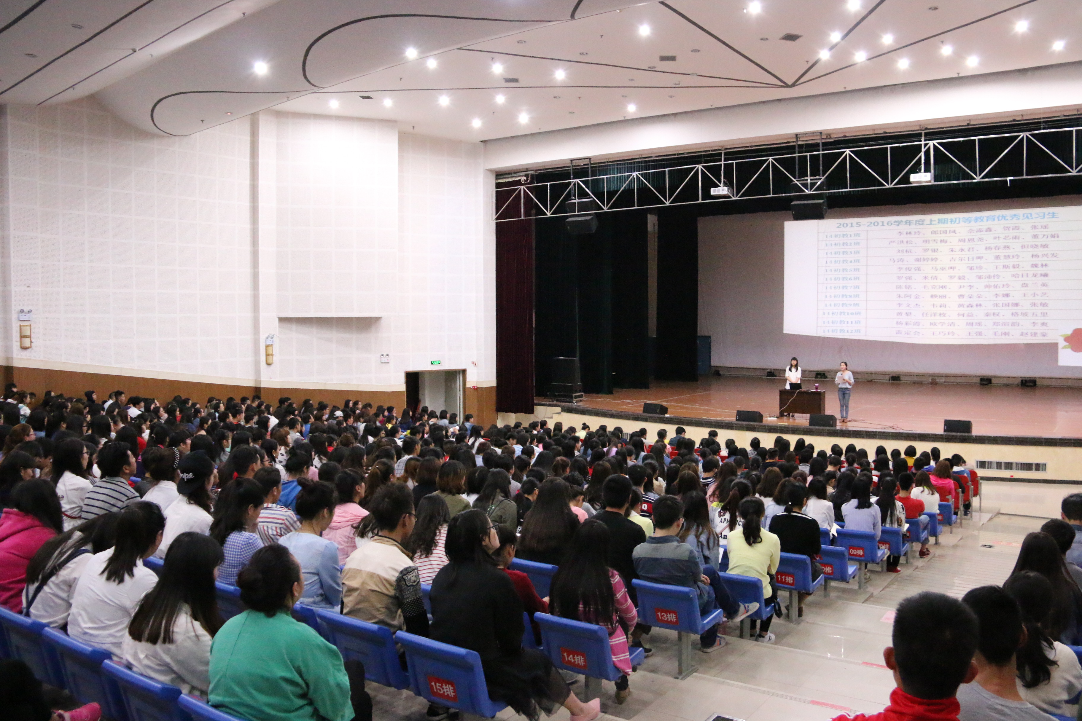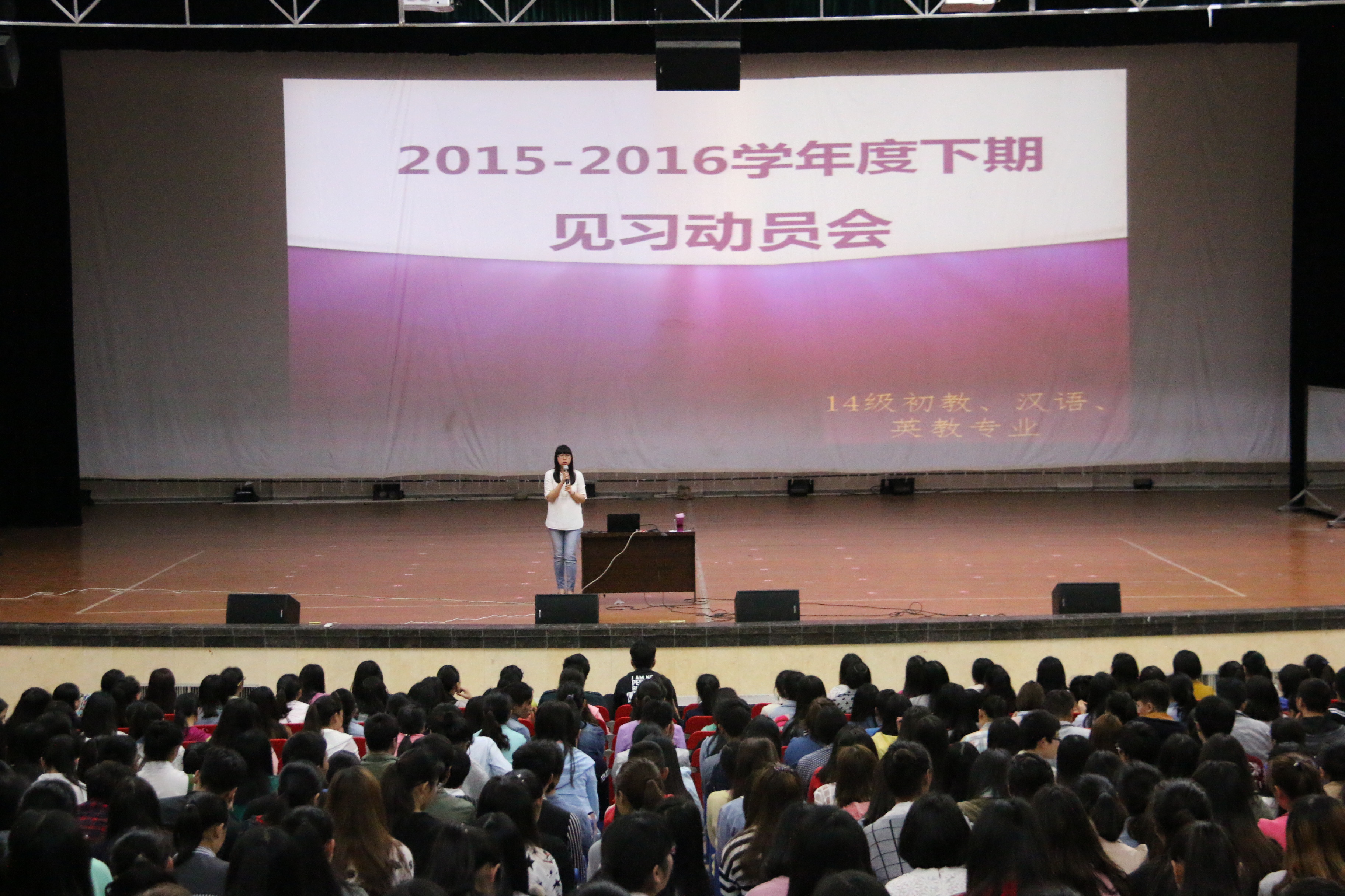 本学期2014级初教、英教、汉语专业学生为期两周见习活动即将开始。为进一步巩固上学期见习活动的成效,更好地开展本学期见习活动,师范教育系于4月24日晚在艺术中心,向2014级初教、英教、汉语三个专业共1200余名学生召开了见习动员大会。初等教研室主任伍成艳主持了会议,师范教育系副主任(主持工作)张雪艳、学生科科长李兴龙以及各班辅导员出席了本次动员会。