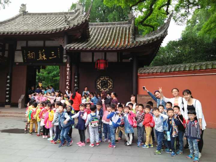2016年4月29日,15级学前教育专业11班同学参加了由实验幼儿园大四班组织的游三苏祠活动。此次春游由幼儿园老师带队,对口班同学协助并负责幼儿的安全。早晨9点出发前,幼儿园老师与同学们一起对孩子们背包中的食物、玩具和衣着进行了仔细地检查,同学们与孩子们经过30分钟的徒步来到了历史悠久的三苏祠。到达后,导游为大家讲解了三苏祠的由来和“三苏”的历史事迹,还带领大家参观了三苏祠东西厢房和正厅,最后大家到三苏祠后花园进行自由参观。