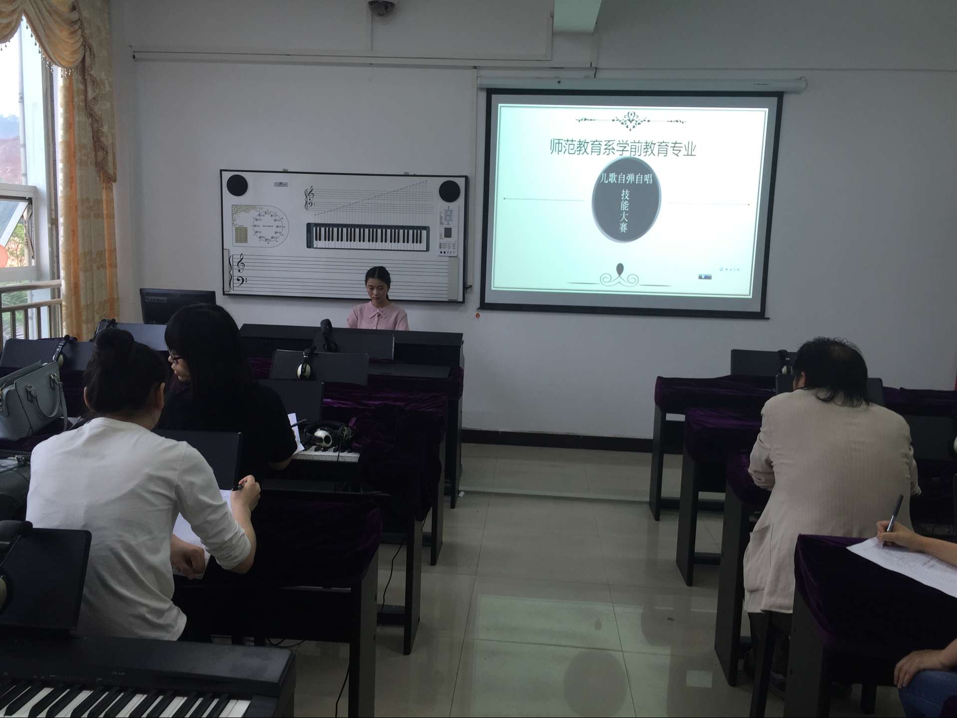 为强化学生弹唱技能,本着“以赛促练,以赛促教”的宗旨,2016年5月25日,师范教育系学前教育专业举办了幼儿歌曲弹唱比赛,音乐组专业教师应邀担任比赛评委。