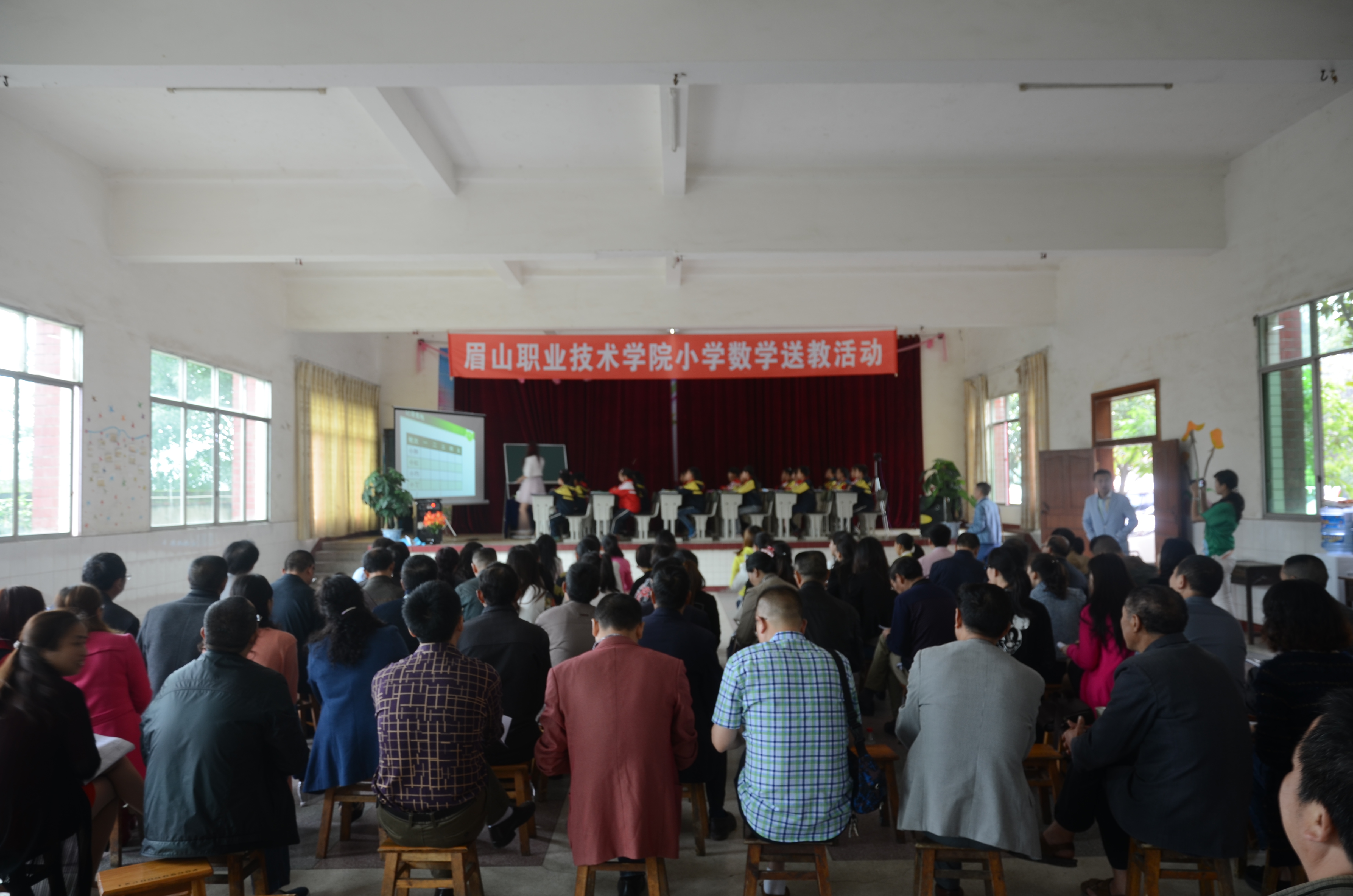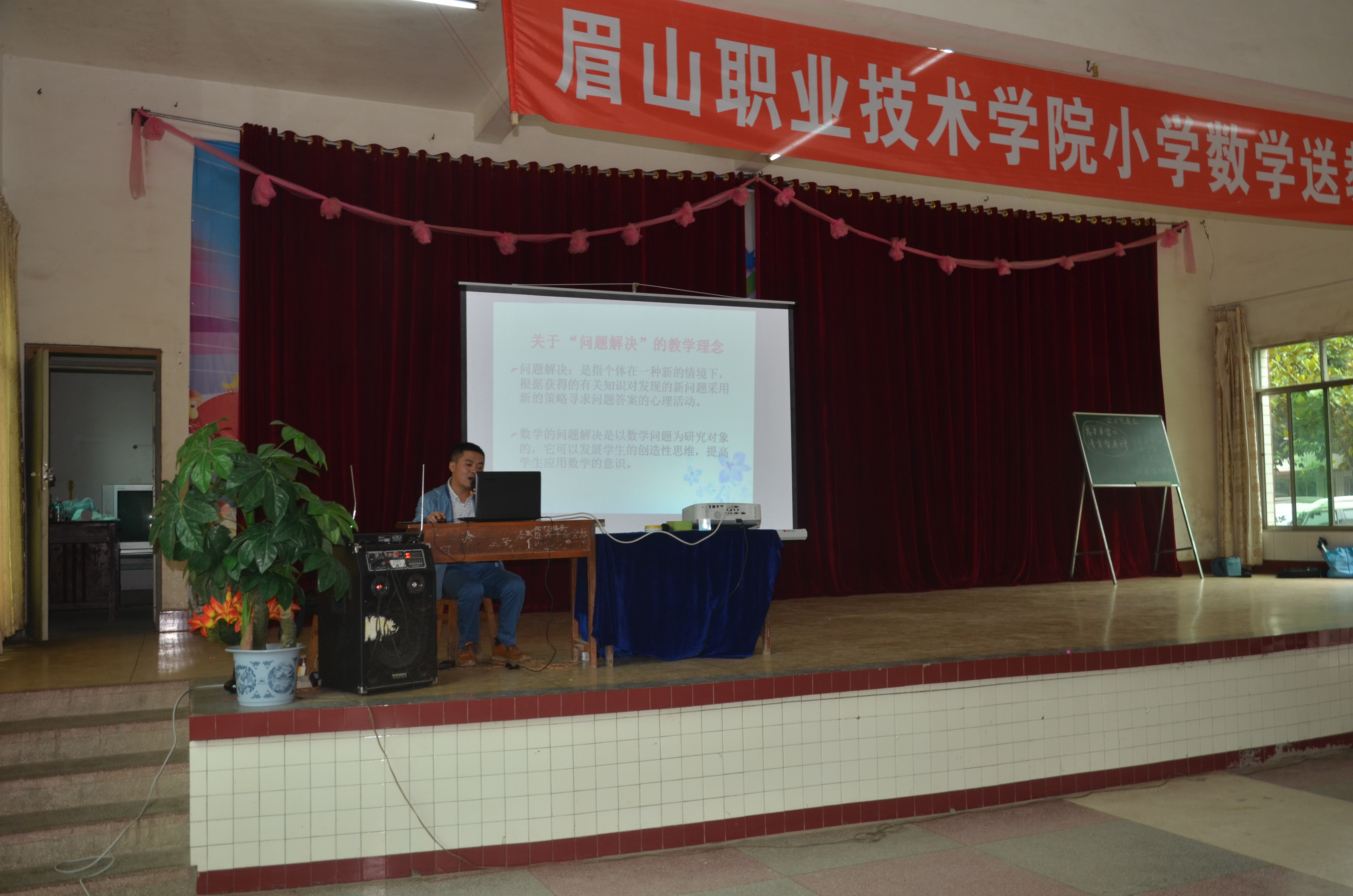 2016年5月27日,丹棱县何场小学浓荫一片,春意盎然,眉山职业技术学院小学数学送教活动在这里举行。按照我校与丹棱县教育局签订的社会服务方案,初等教育专业送教团队对丹棱县小学数学教师近百人,进行了小学数学“解决问题”的专题培训。