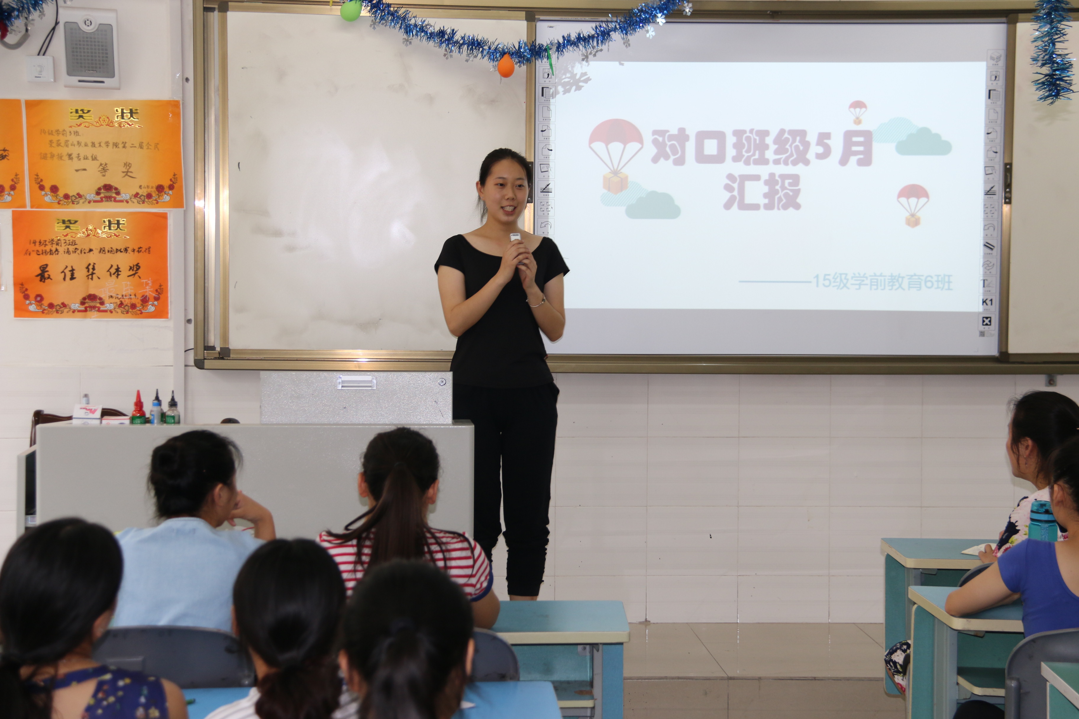 2015级对口班的学生代表将本班对口活动进行了汇总,他们向老师和同学分享了各班级在本学期开展的丰富多彩对口班活动:协助幼儿园组织春游活动、独立组织幼儿园教学活动、开展“五一”劳动节主题活动、组织幼儿艺术风采大赛、参加幼儿园对口班级环创设计、协助和组织幼儿园“六一”活动等等。通过参与幼儿园对口班活动,同学们不仅更加熟悉幼儿园各项工作,还提升了大家的幼儿园实践能力。(撰稿:郭静)
