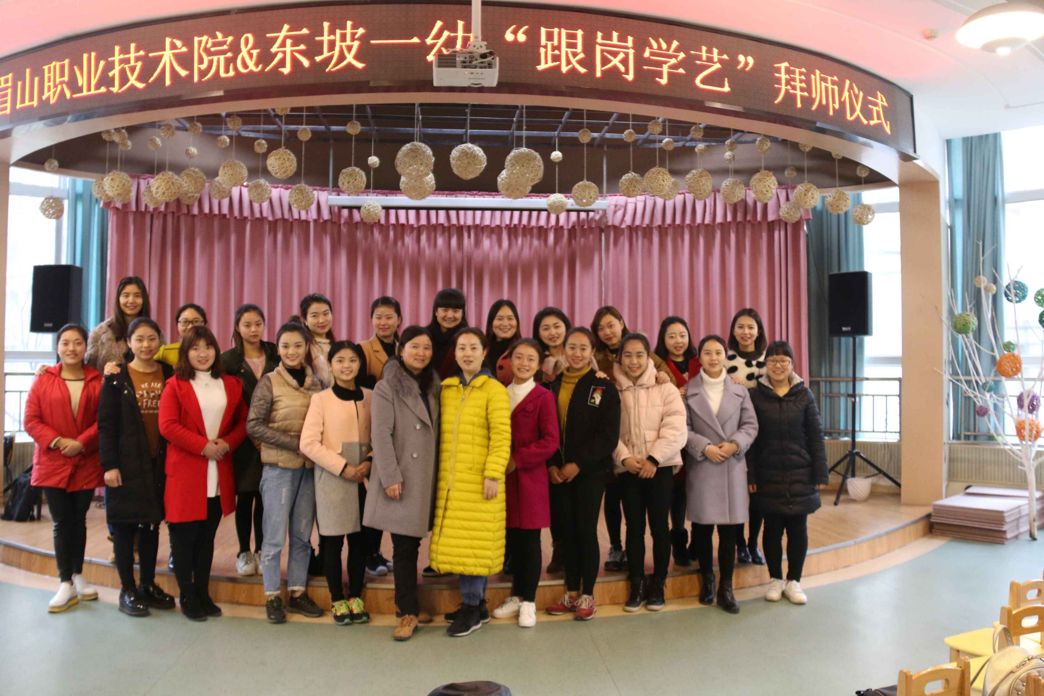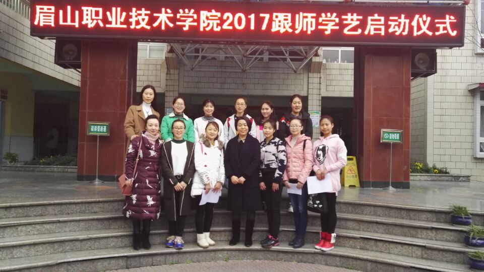 2017年3月2日,在师范教育系的统一安排下,学前教育专业2015级45名优秀学生分别到眉山市一幼、机关幼儿园、实验幼儿园、东坡区一幼、宝贝家幼儿园等合作幼儿园开展本学期“跟师学艺”活动。在拜师仪式上,师范教育系带队领导就本次“跟师学艺”活动向园方进行了详细介绍,对“跟师学艺”学生提出了要求,接着幼儿园指导老师与学生现场进行了拜师结对,合影留念。