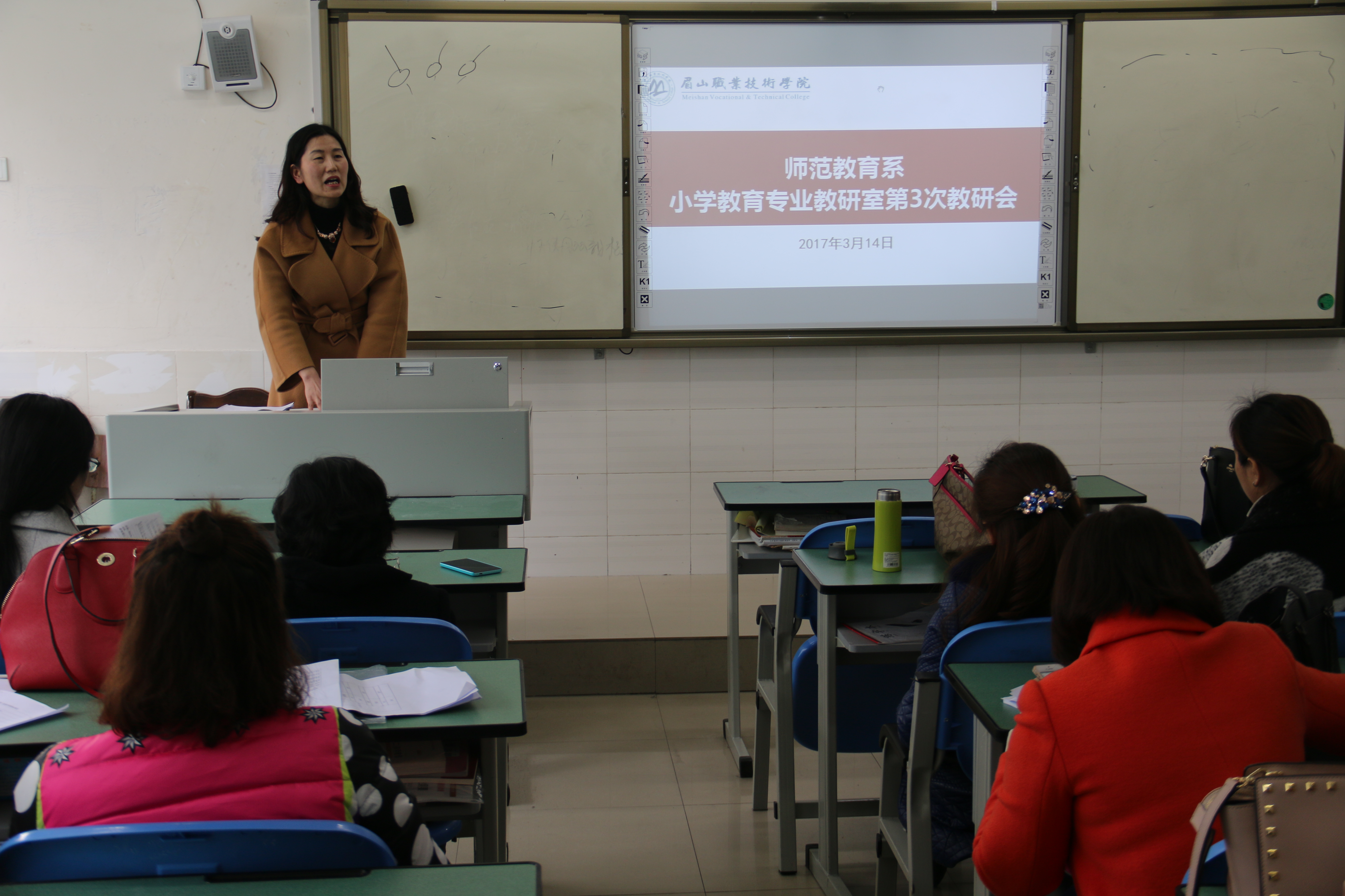 2017年3月14日下午2:00,师范教育系小学教育专业教研室在1208教室召开本学期第三次教研会。系副主任(主持工作)张雪艳参会指导,小学教育专业教研室全体教师参加会议,会议由小学教育专业教研室主任胡小波主持。