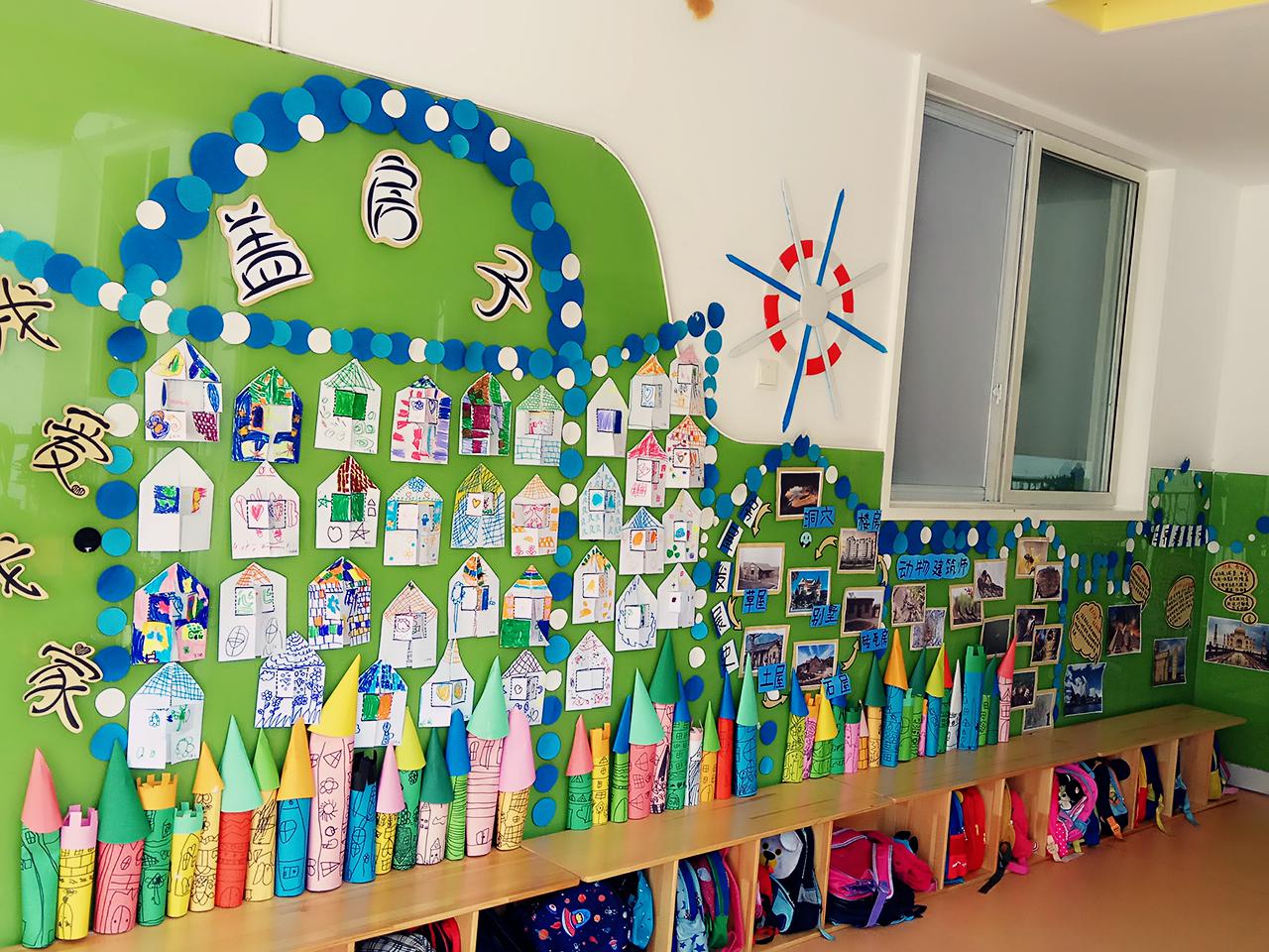 同学们结合《幼儿园环境创设》课程理论知识,在对口班级老师的指导下,以幼儿的参与性和兴趣点、墙面创设的动态性为切入点,选取孩子们的手工绘画作品,大家一起展智慧,齐动手,进行精心设计与布置。主题墙的创设充分体现了幼儿与环境的互动,发挥了其学习的主体作用。