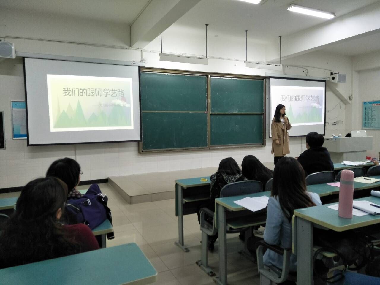 苏南小学代表在讲述两个月以来跟师学艺的历程后,还着重分享了遇到的的两次挑战:一是跟师学艺第一天办黑板报;二是初登讲台,紧张备课。苏南小学代表还特别说道:衷心感谢师范系各位老师的付出,没有你们,就没有我们跟师学艺的机会。