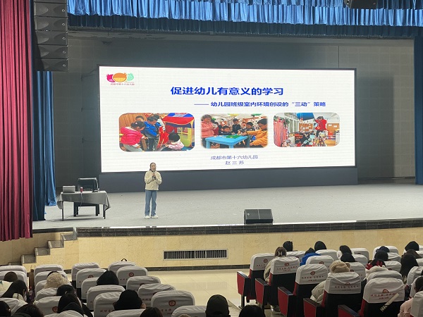 12月22日下午,成都第十六幼儿园执行园长赵三苏在艺术中心为2021级学前教育专业学生开展“创设促进儿童有意义的学习环境——幼儿园班级室内环境创设的‘三动’策略”专题讲座,讲座由教师曹冉主持,师范教育系副主任王其红出席讲座。