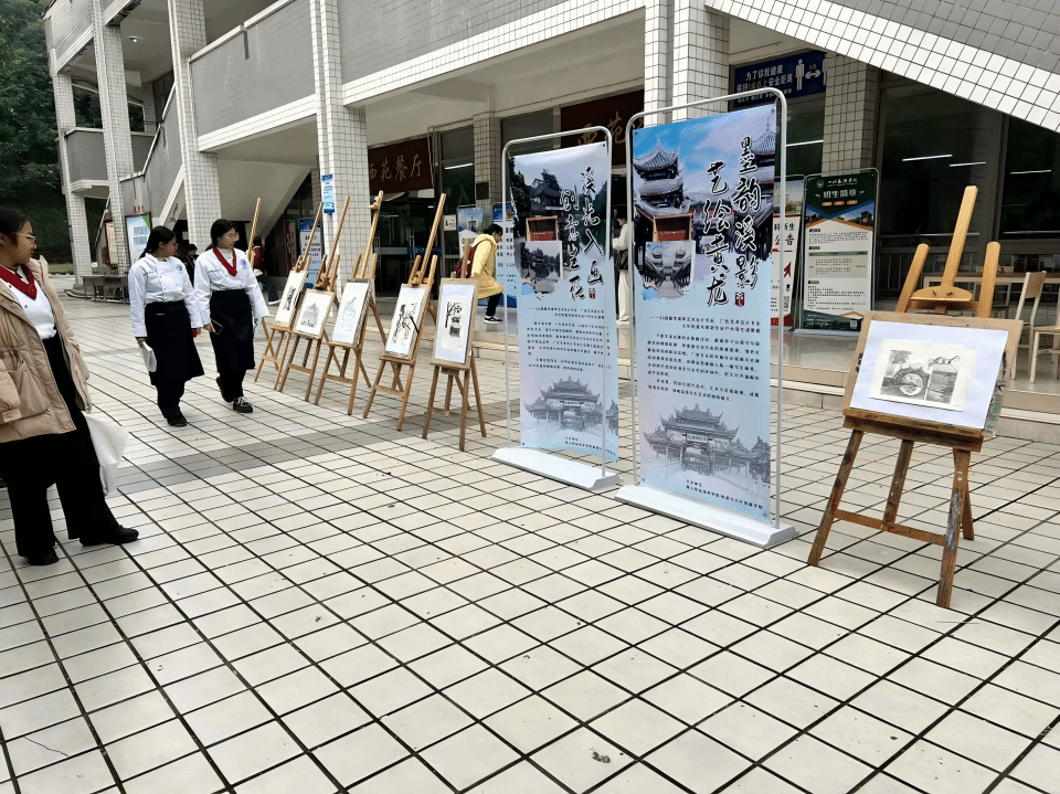 12月5日,教育与文化传媒学院在校园西苑食堂外举办了“墨韵溪影,艺绘黄龙——24级数媒、文创、广告专业户外写生成果展”,此次展览集中展示了文创、数媒、广告专业的学生们在黄龙溪写生实践中的优秀成果,吸引了全校师生们的广泛关注。