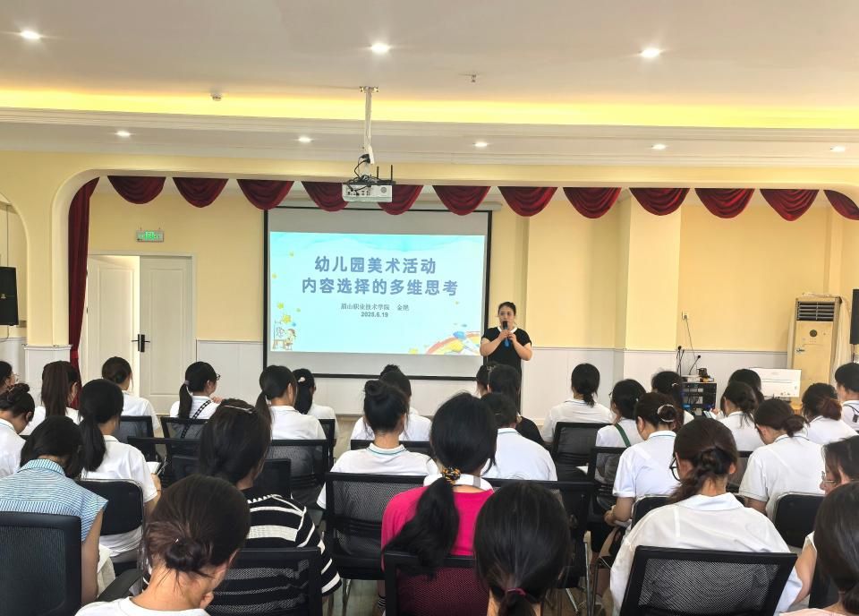 6月19日,眉山职业技术学院教师金艳受邀走进东坡区锦程幼儿园,以“幼儿园美术活动内容选择的多维思考”为主题开展专题培训,为园所教师带来兼具理论高度与实操价值的专业指导。