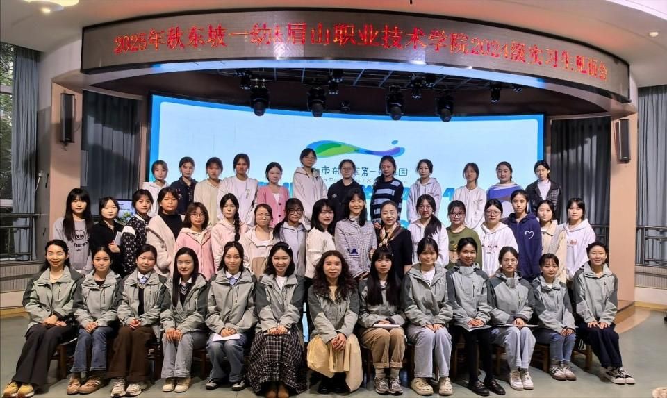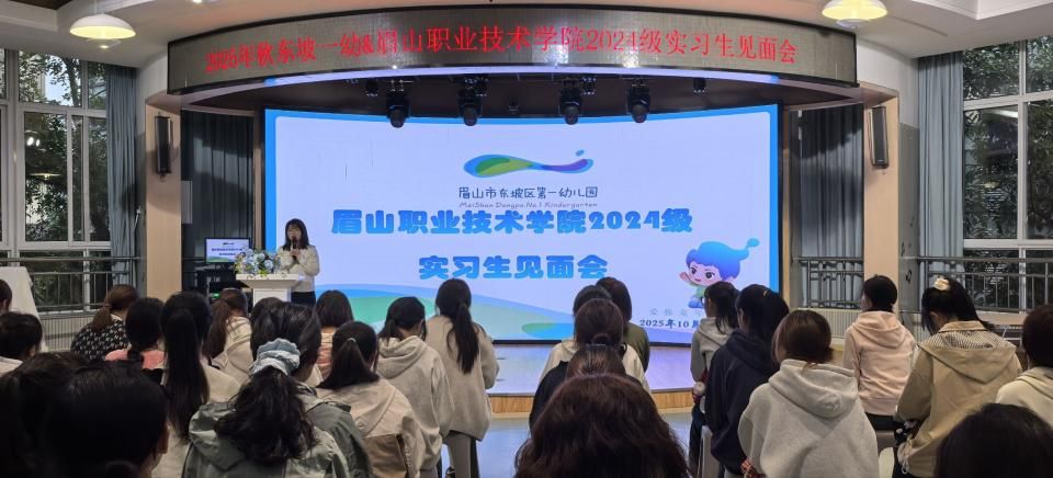10月20日,东坡区第一幼儿园在多功能厅为眉山职业技术学院2024级学前教育专业的24名见习生举行入园欢迎仪式。会议由东坡区一幼教科主任黄迪主持,现场气氛庄重而热烈。